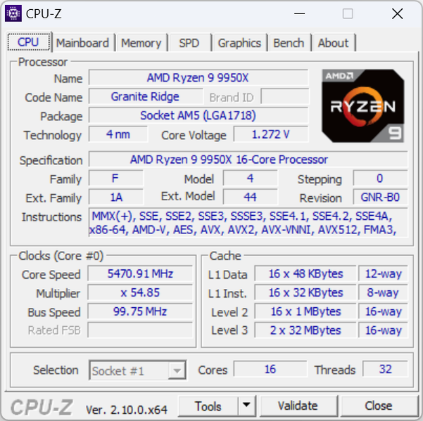 | Ryzen 9 9950X | 16/32 | 4,3 | 5,7 | 16 | 64 | 170/230 | 649 |