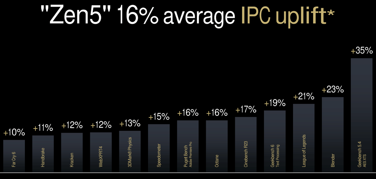 Самой AMD заявлено 16% увеличение производительности в расчете на такт, это среднее значение по сравнению с Zen 4 показывает улучшения в различных тестах, включающих 10% прироста в игре Far Cry 6, 17% при рендеринге в Cinebench и впечатляющие 21% в игре League of Legends. Ну а самое мощное заявление — улучшение на 35% в тесте Geekbench 5.4 AES-XTS, который использует VAES+ и AVX10/AVX512, что объясняет такой прирост скорости в случае с Zen 5. Скорее всего, в более типичных применениях разница будет несколько ниже — именно это мы сейчас и узнаем.