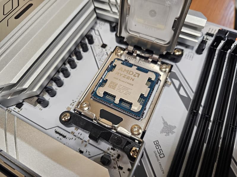 Процессор Ryzen 9 9950X поставляется в коробке, которая выглядит аналогично упаковке решений поколения Ryzen 7000, да и сам чип выглядит почти точно как более ранние процессоры для Socket AM5 — есть лишь мелкие изменения по компонентам на печатной плате. У нас на тесте была OEM-версия без коробки, так что есть фотографии только самого процессора:
