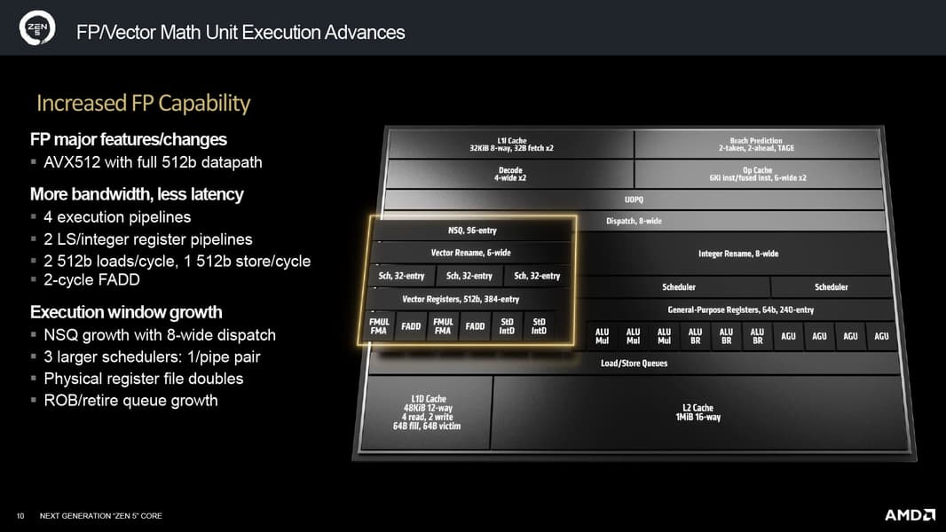 Очень большие изменения в Zen 5 произошли в блоках операций с плавающей запятой. Исторически компания AMD довольно консервативно улучшала возможности векторных расширений — например, процессоры Athlon обрабатывали 128-битные инструкции SSE как две 64-битные микрооперации долго время, и только в Phenom это изменилось. В Zen 4 уже наблюдался перелом тенденции, а Zen 5 еще пошел вперед еще дальше в отношении AVX512-инструкций. По сравнению с мобильными Zen 5 решениями, настольные CPU этой архитектуры имеют несколько больший транзисторный бюджет и площадь кристаллов на сами ядра и кэши, поэтому в настольной серии CPU используется более агрессивная реализация AVX-512, хотя в мобильных процессорах остался более консервативный подход.