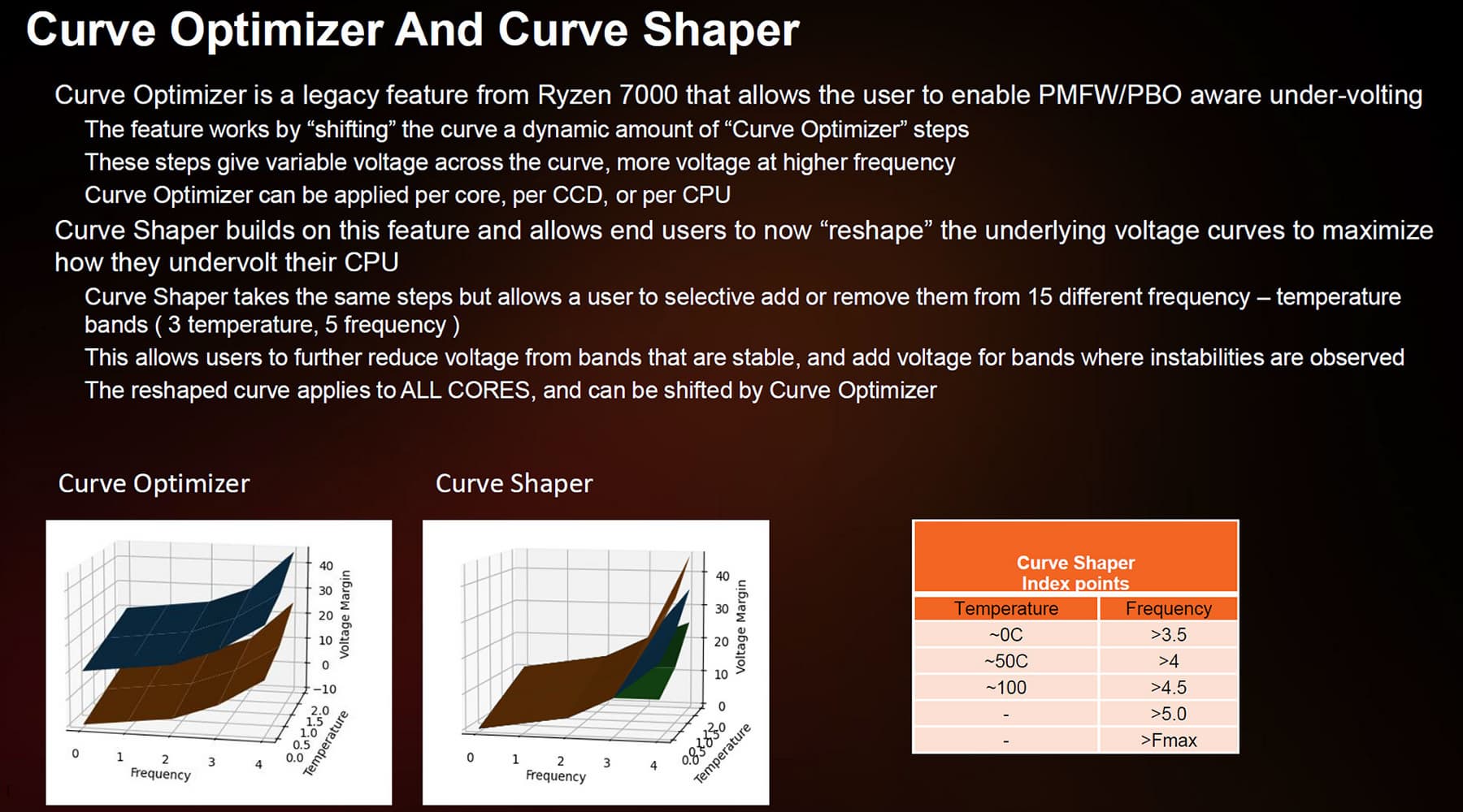 В целом же, разгон Ryzen 9 9950X довольно прост — из-за разблокированного множителя. Ручной разгон всех ядер позволяет запуск множества несложных рабочих нагрузок до частоты примерно 5,3 ГГц, но самые тяжелые приложения будут работать примерно до 5,2 ГГц для всех ядер, что неплохо. Разгон с использованием PBO и Curve Optimizer работает как и на старых моделях. Новая функция Curve Shaper позволяет динамически регулировать напряжение Curve Optimizer в зависимости от частоты и температуры. Температурный предел по умолчанию всё так же составляет 95 °C и не может быть повышен, но при включении ручного разгона составляет 115 °C, как и раньше.