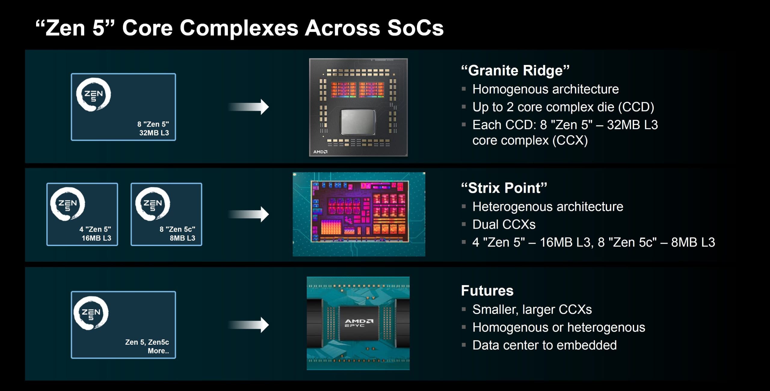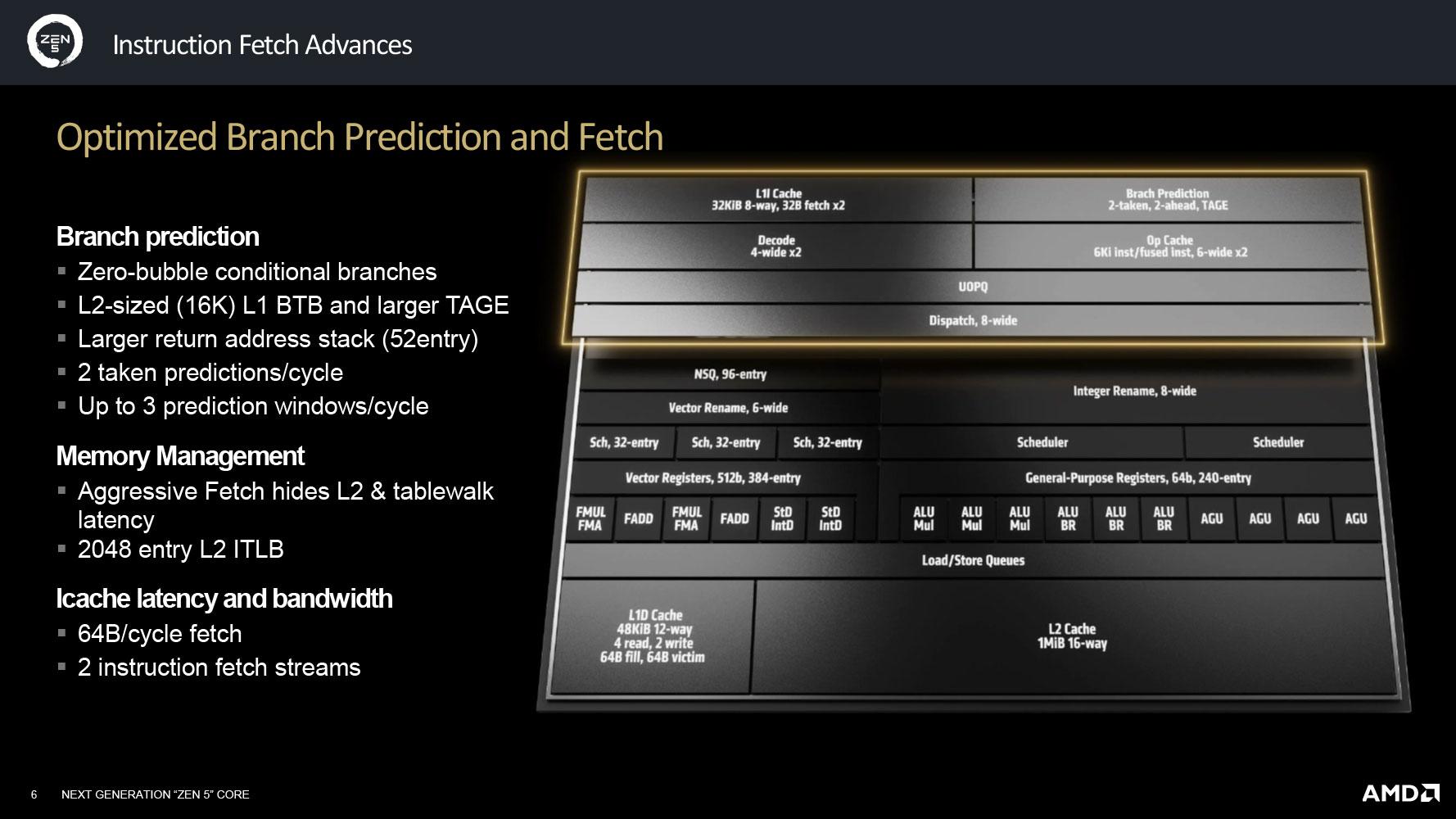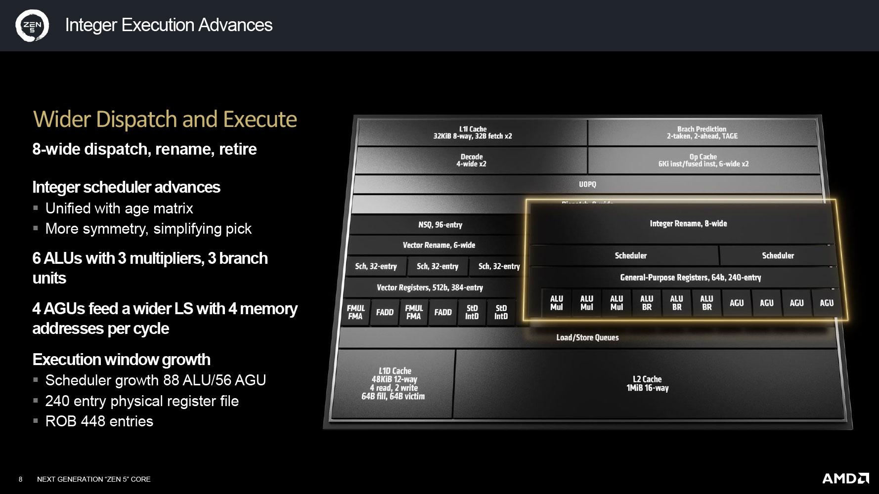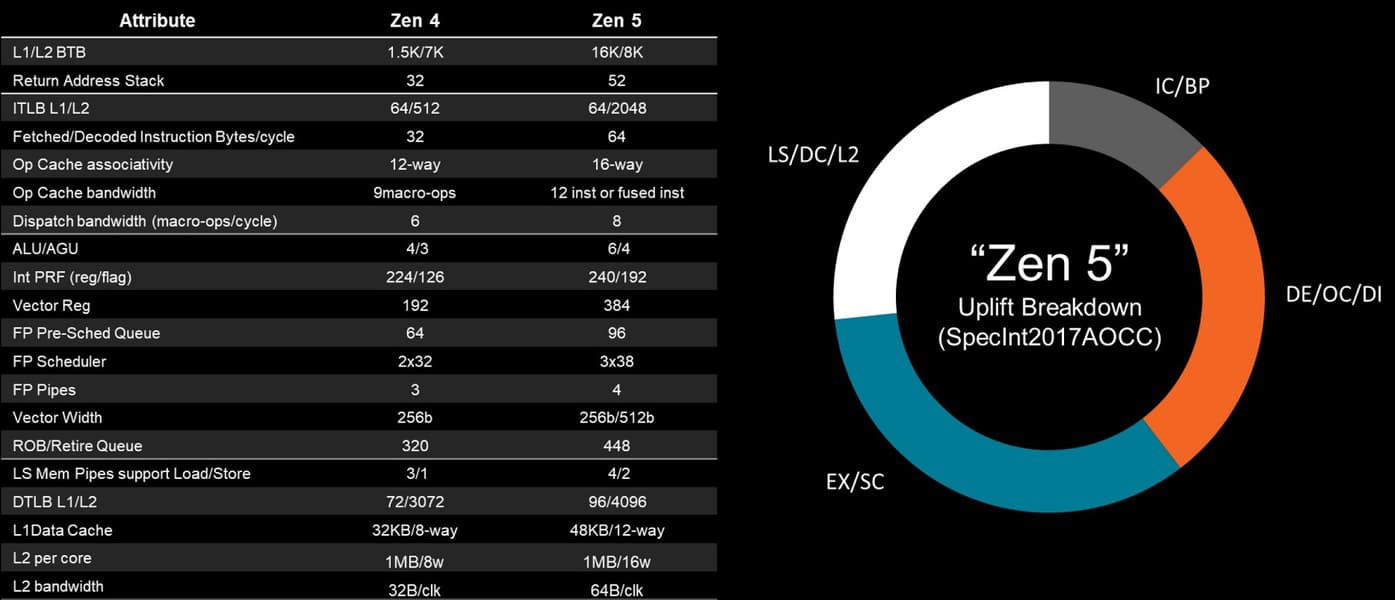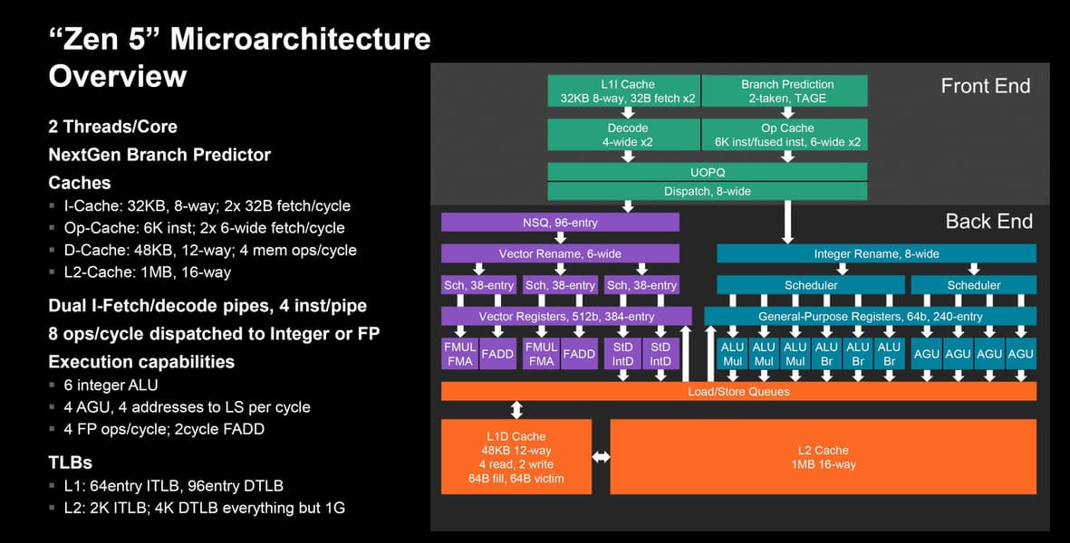 Значительные изменения внесли в аппаратную часть предсказания ветвлений — блоки выборки и декодирования разделили на две части для оптимизации многопоточного исполнения, планировщик был объединен и унифицирован, увеличена таблица трансляции адресов, как и кэш-память первого уровня — она ускорена и увеличена в объеме. В целом, все блоки Zen 5 способны одновременно исполнить большее количество инструкций по сравнению с Zen 4.