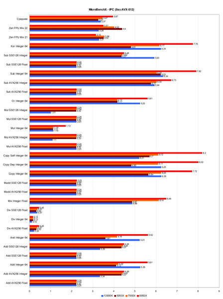 И это при том, что производительность на такт из-за архитектурных улучшений порой действительно впечатляла — например, в некоторых криптографических тестах, в части научных задач, при обработке видеоданных — в основном с использованием оптимизированного под AVX-512 кода, который действительно серьезно ускорился. Предполагаемые причины небольшой разницы в остальных случаях мы объяснили еще в начале материала: при всех архитектурных улучшениях тактовые частоты ядер немного снизились, задержки межъядерного взаимодействия выросли более чем вдвое (но это вроде бы решили в последних версиях BIOS — мы еще не проверили), а максимальная скорость памяти осталась на уровне Ryzen 7000.
