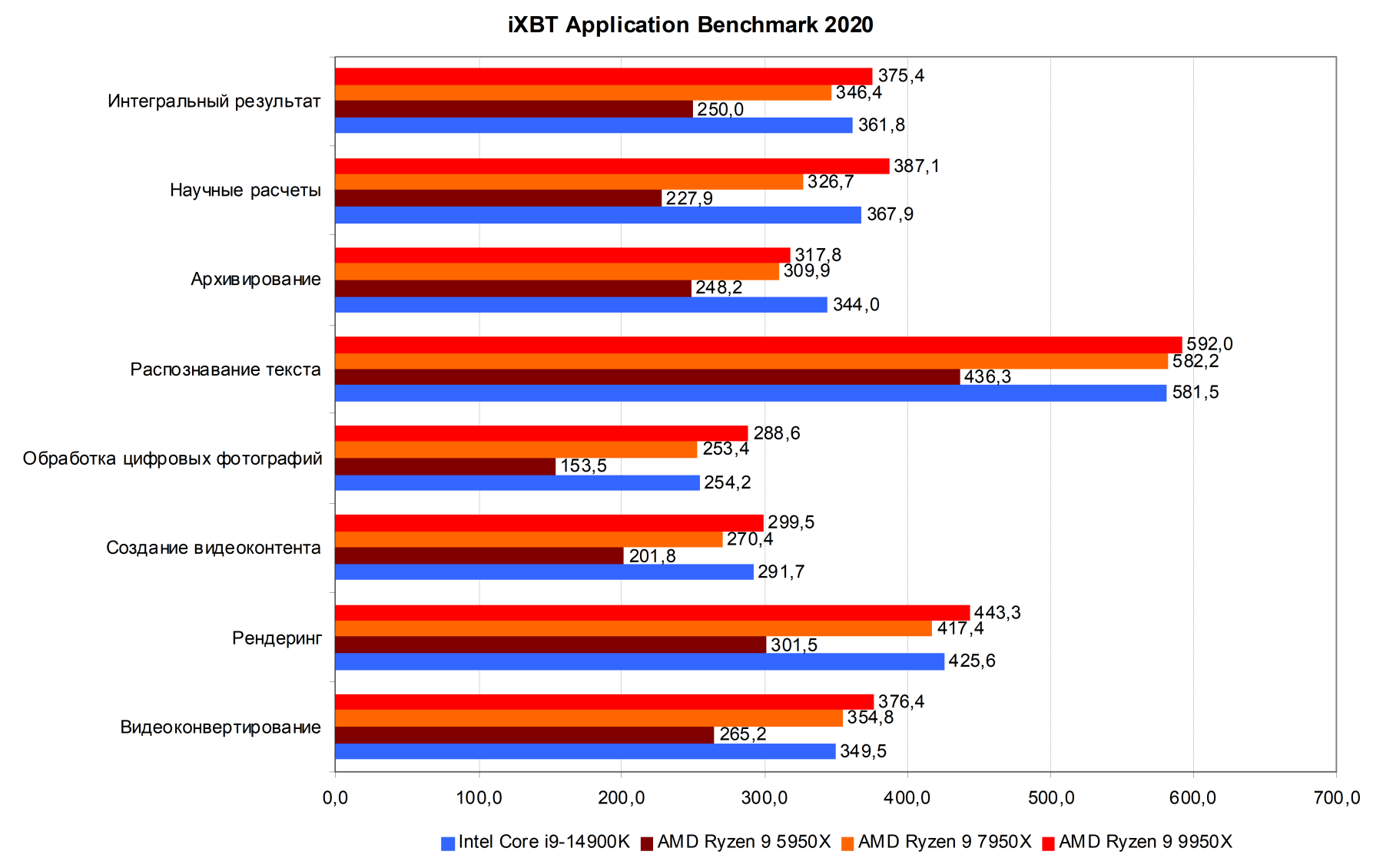 Подробный анализ этих результатов традиционно оставляем вам, сами отмечаем лишь самые важные и любопытные моменты. В научных расчетах ранее лучше выступали процессоры Intel, но сегодняшняя новинка Ryzen 9 9950X не просто серьезно подтянулась к Core i9-14900K в этом наборе тестов, но и опередила его. А вот в задачах архивирования данных обойти флагмана Intel не получилось — преимущества над Ryzen 9 7950X тоже нет. В среднем же топовые процессоры AMD и Intel достаточно близки, даже при том, что 14900K вышел годом ранее и основан на довольно старой архитектуре.