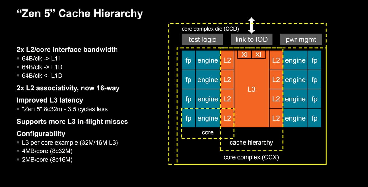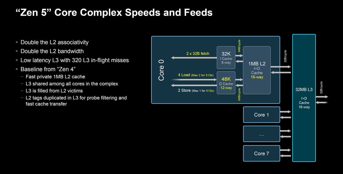 Но и это еще не всё — в Zen 5 быстрее работает и L2-кэш. Пропускная способность была улучшена, хотя он по прежнему имеет объем в 1 МБ на каждое ядро. AMD уверяет, что удвоила его ассоциативность и пропускную способность по сравнению с Zen 4 — при помощи вдвое более широкого соединения с L1-кэшем — 512-бит (64 байта) данных.