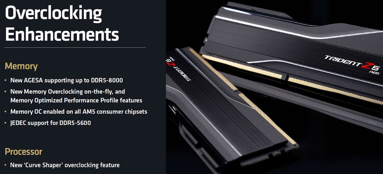 Что касается работы с памятью, то официальная поддержка была увеличена до DDR5-5600, а также была добавлена поддержка разогнанной памяти стандарта DDR5-8000. В таком случае делитель тактовой частоты между FCLK и MCLK становится на 1:2 при превышении частоты памяти предела в DDR5-6000. Как и в случае с предыдущими процессорами, можно попробовать принудительно установить делитель 1:1 до частот порядка DDR5-6400 — тут изменений нет. А вот поддержка DDR5-8000 реализована при помощи обновления AGESA, и она будет и для старых чипсетов серии 600. Пока что не очень понятно, будет ли DDR5-8000 с делителем 1:2 быстрее DDR5-6000 с делителем 1:1 на практике, но в целом возможность интересная.