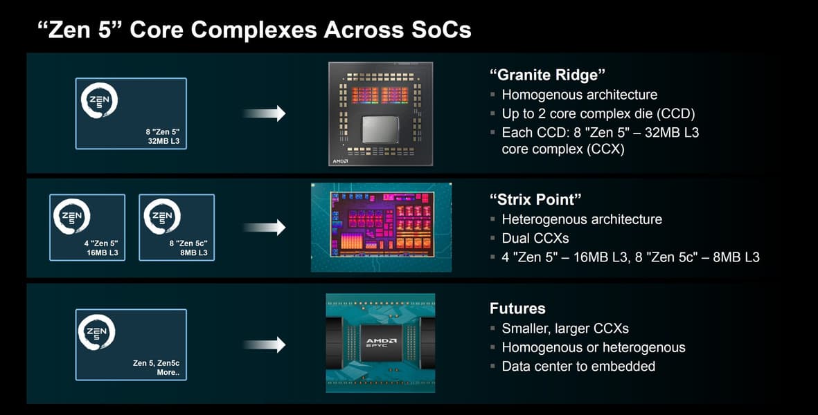 Наиболее полно задумки архитектуры Zen 5 реализованы не в настольных процессорах Ryzen 9000, а в мобильные решениях серии Ryzen AI 300 — чипах, предназначенных для ноутбуков. Впрочем, заложенный в Zen 5 задел скажется и на дальнейшем развитии архитектур компании — Zen 6 и Zen 7, в которых ожидаются значительные обновления, и не все изменения Zen 5 дадут улучшения эффективности прямо сейчас, многие из них нацелены больше на перспективу. В новой архитектуре вычислительных ядер обновили почти все ключевые области вычислительных ядер, включая блок предсказания ветвлений, различные кэши, конвейеры выборки и декодирования, механизм выполнения и загрузку/сохранение данных.