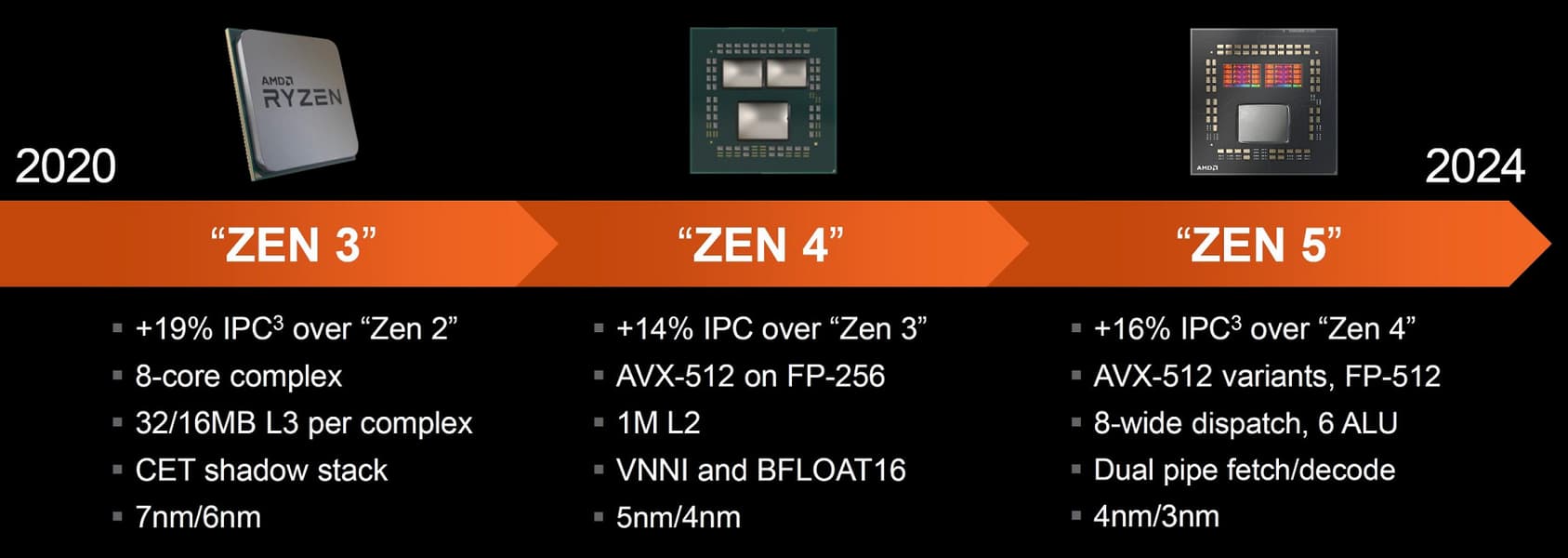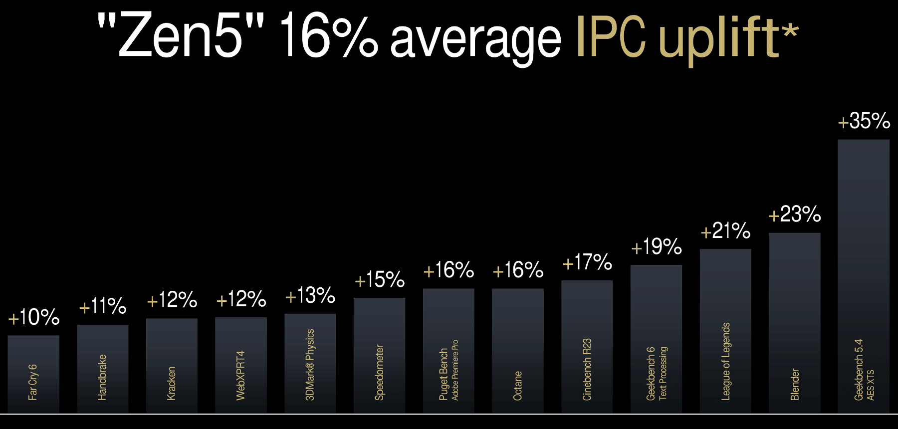 Компания AMD стремится обеспечить улучшение производительности на такт (IPC) с каждым новым поколением Zen, и между поколениями оно обычно составляло от 10 до 20%. В случае с Zen 5 компания объявила о примерном улучшении вычислительной скорости на 16% по сравнению с Zen 4. Треть этой прибавки обеспечивает увеличение количества исполнительных устройств, еще четверть прироста принесли изменения декодера и кэша микроопераций, а еще 25% дали изменения в системе кэширования. Остальная часть ускорения осталась за оптимизацией процесса предсказания переходов и предвыборки (предсказатель ветвлений и в Zen 4 был неплох, а в Zen 5 его сделали еще эффективнее), а также увеличением таблиц истории переходов и улучшением в отслеживании длинных ветвей кода.