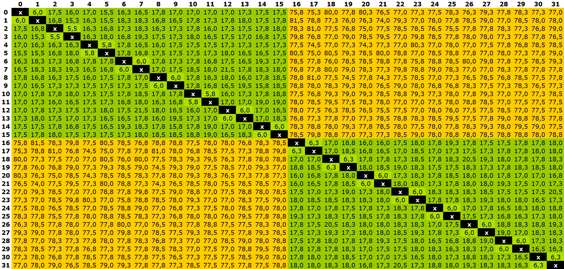 Все ядра многоядерных процессоров должны иметь доступ к памяти — каждое ядро имеет собственные кэши, и если одно ядро хочет прочитать данные, записанные другим ядром, внутренние соединения в процессоре должны выполнить передачу их из кэша в кэш. В Zen 5 всё так же достаточно быстра передача таких данных из кэша в кэш в пределах кластера на 8 ядер, но задержки между двумя кластерами повысились по сравнению с предыдущими поколениями — порядка 200 нс задержки между кластерами это почти так же много, как между сокетами на серверных платформах.