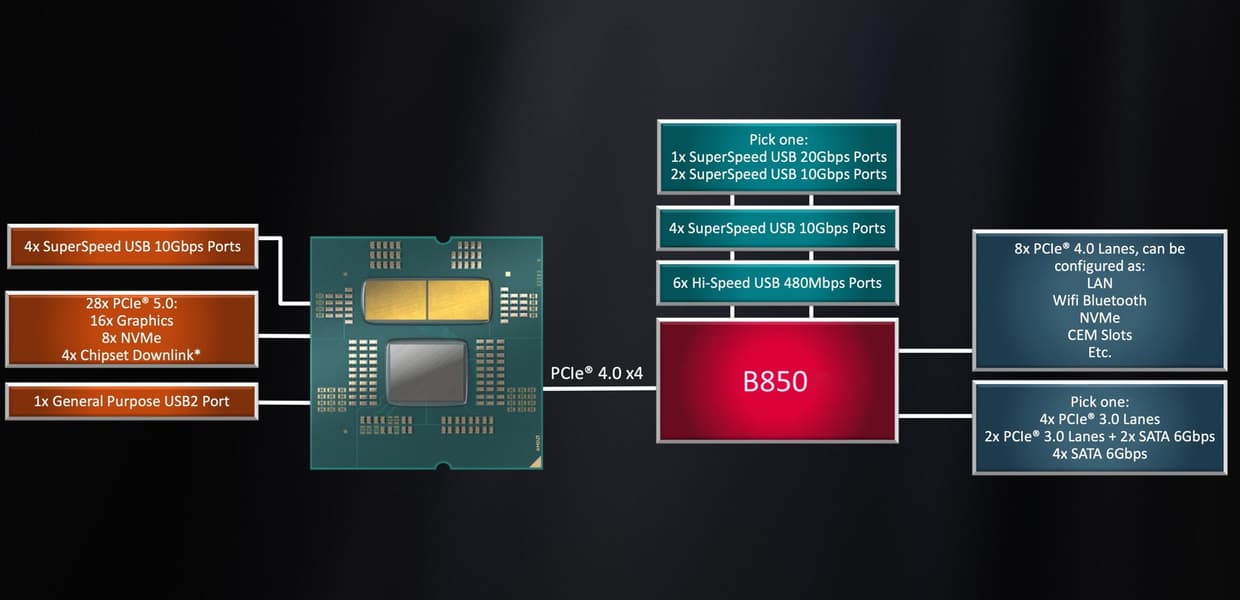 B850 — это среднеценовой чипсет линейки, который по характеристикам повторяет B650. Чипсет основан на всё том же чипе Promontory 21, поэтому и отличий между ним и X870 нет — и в этом случае можно реализовать порты USB 4. А вот что делать с разъемом видеокарты в этом случае решают производители системных плат, они могут использовать шину PCIe 5.0 или 4.0. Главное отличие от аналогичной модели прошлого поколения — тут можно разделить 16 линий для видеокарты на два слота по 8 линий.