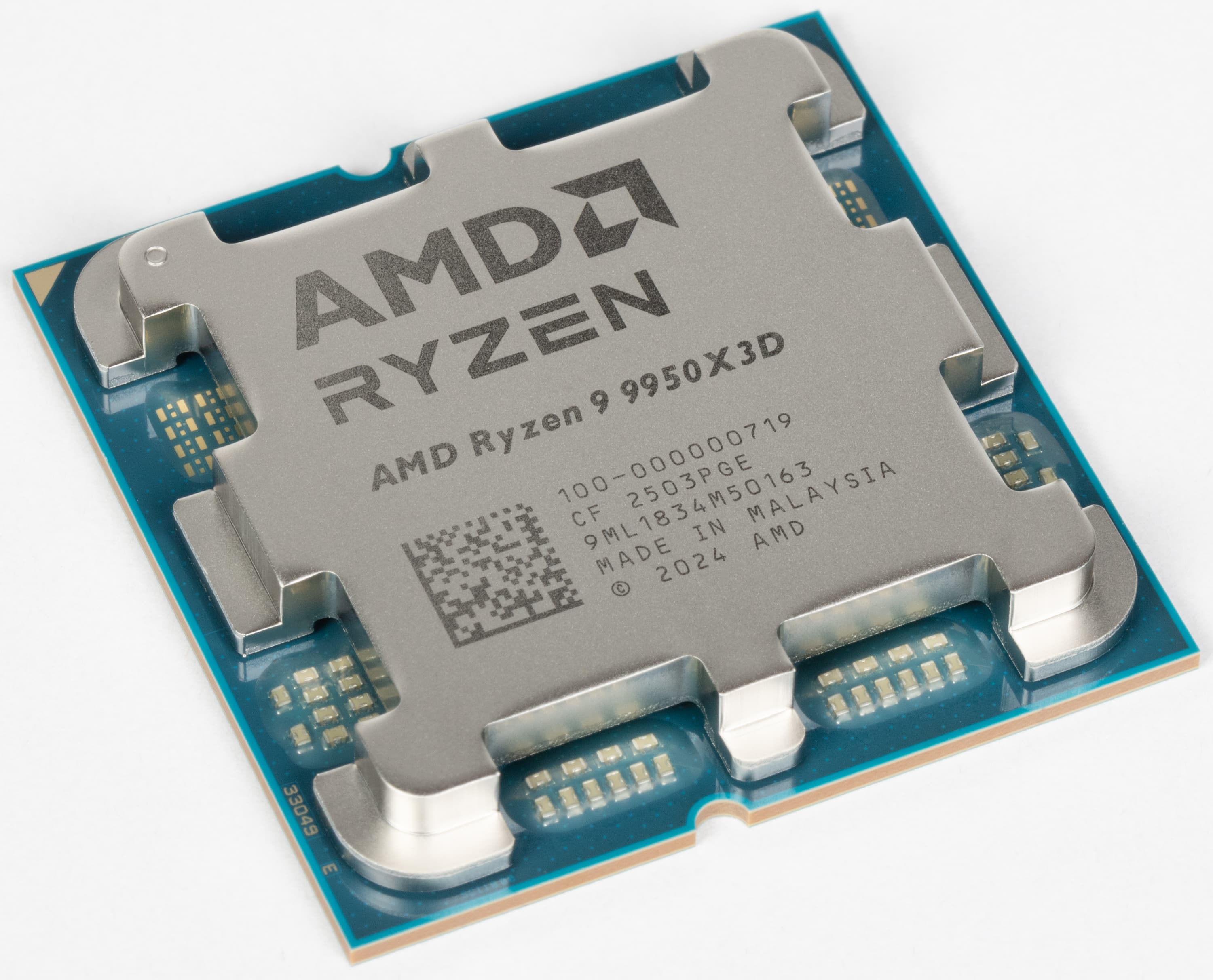 Процессор Ryzen 9 9950X3D поставляется в небольшой коробке без комплектной системы охлаждения, которая выглядит аналогично упаковке решений поколения Ryzen 7000 и других процессоров Ryzen 9000, из внешних отличий разве что есть указание на принадлежность процессора к 3D V-Cache технологии. Сам чип выглядит почти точно как более ранние процессоры для Socket AM5 — есть лишь мелкие изменения по цвету подложки и компонентам на печатной плате.