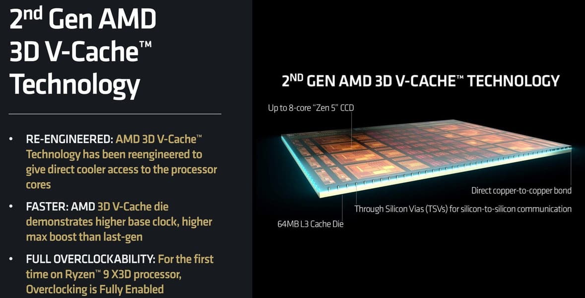 Это повышение частот стало возможным благодаря изменению конструкции дополнительного кэша — технологии 3D V-Cache второго поколения, первым представителем которой стал Ryzen 7 9800X3D. В предыдущих X3D-процессорах для расширения кэш-памяти третьего уровня поверх вычислительного кристалла CCD устанавливали дополнительный кристалла с SRAM, который подключался прямо к L3-кэшу в CCD, увеличивая его объем с 32 МБ до 96 МБ. Дополнительный кристалл с кэш-памятью поверх CCD сильно мешал охлаждению, отведение от него тепла ухудшилось — это мешало повышению частот вычислительных ядер X3D-процессоров предыдущих поколений. В Ryzen 9000X3D сделали логичный шаг, переместив дополнительный кристалл с SRAM под кристалл CCD, и теперь кристалл с кэшем уже не усложняет охлаждение основного кристалла с вычислительными ядрами, отдающего тепло сразу к теплоотводящей крышке.