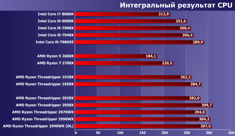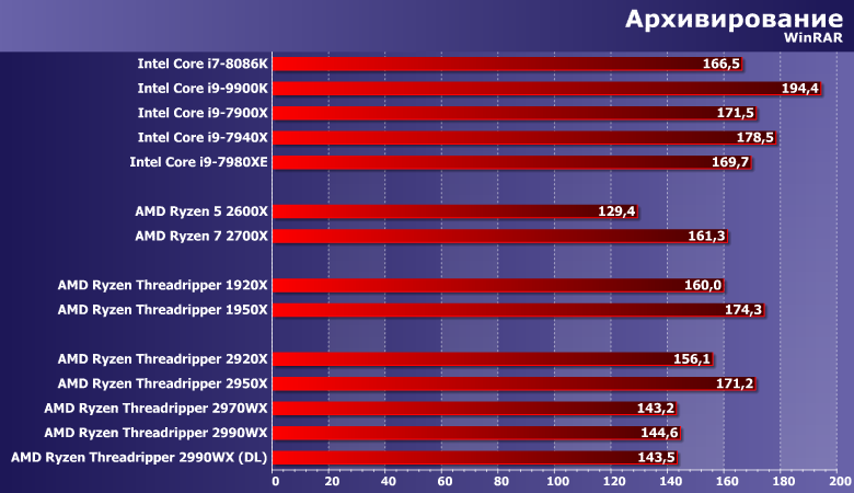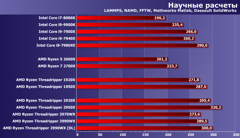 Казалось бы, чем больше ядер — тем лучше. Но и тут есть нюансы. Во-первых, 2920Х сумел догнать 1950Х несмотря на меньшее количество ядер — улучшение их качества дало о себе знать. При этом от 2950Х он отстает больше, чем 1920Х от 1950Х, т. е. наблюдаем очередное подтверждение того, что какие-то «затыки» компания в Zen+ подправила явно — масштабируемость Threadripper улучшилась. Правда WX это не слишком помогает — 2970WX и 2990WX методом грубой силы обогнали всех остальных участников, но не принципиально. А друг от друга и вовсе практически не отличаются.
