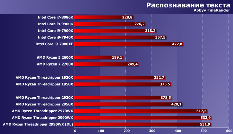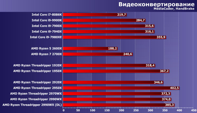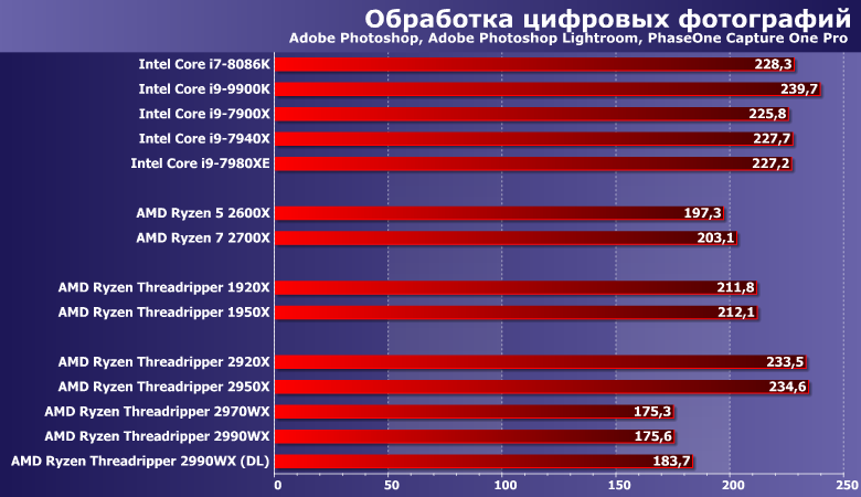 Lightroom — заметно ускоряет, что и на общем результате в группе сказаться может. Хоть и не принципиально — WX здесь совсем не блещут, да и вообще положение многоядерных моделей в целом даже хуже, чем при работе с видео. В общем, не те задачи, ради которых такие процессоры имеет смысл приобретать. Хотя абсолютные результаты Х-серии «второго» поколения и неплохи, но с практической точки зрения это значимо разве что для 2920Х.
