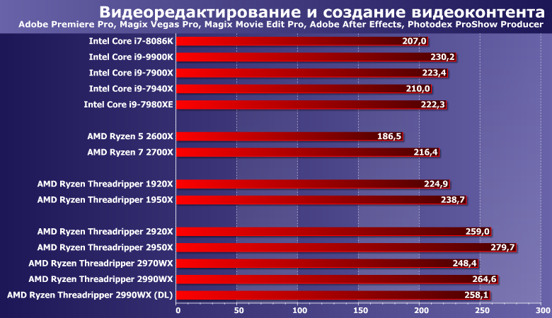 Поддержка многопоточности в этих приложениях неплохая, но ограниченная — так что гоняться за многоядерными «монстрами» не слишком-то и нужно. Особенно если говорить о процессорах Intel, где Core i9-9900K (на самом деле — даже и i7-9700K) обгоняет любые модели под LGA2066. Впрочем, и у AMD тут ситуация лучше, но не принципиально — цена растет куда быстрее производительности. А «второе» поколения лучше «первого» просто потому, что «второе». Да и Dynamic Local лишь замедляет все программы группы.