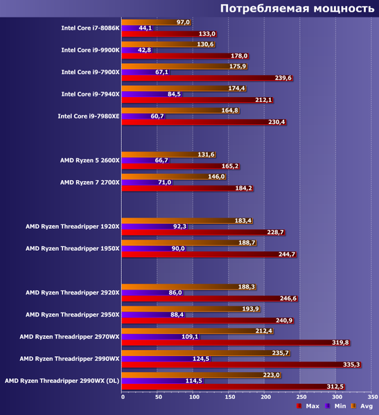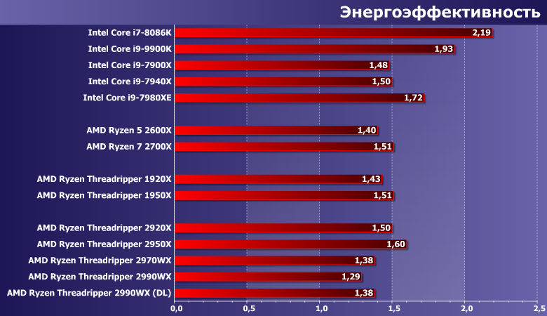 Впрочем, если оценивать все в комплексе, то «энергоэффективность» Ryzen Threadripper соответствует аналогичным моделям для АМ4 — если, конечно, ограничиться и там, и там Х-сериями. Понятно почему — кристаллы, в общем-то, те же. WX же и в этом плане хуже; хотя побочная эффективность режима Dynamic Local заметна, но положение дел не меняет.