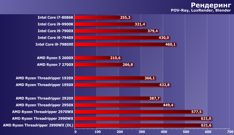 В принципе, уже «первого» поколения Ryzen Threadripper достаточно, чтобы обгонять любые процессоры Intel в этой группе, а если говорить про «второе», то тут уже и 2920Х отстает только от i9-7980XE, так что с межплатформенной конкуренцией дело ясное :) Если же говорить о внутрифирменной, то внимания заслуживают в первую очередь результаты 2970WX и 2990WX. Они практически совпадают, т. е. таким количеством ядер эти программы «хорошо распорядиться» не могут. А вот организационные проблемы у WX-серии общие. Использование режима Dynamic Local их немного ослабляет, но полностью не решает — иначе бы оба процессора работали бы не хуже (как минимум), чем 2950Х.