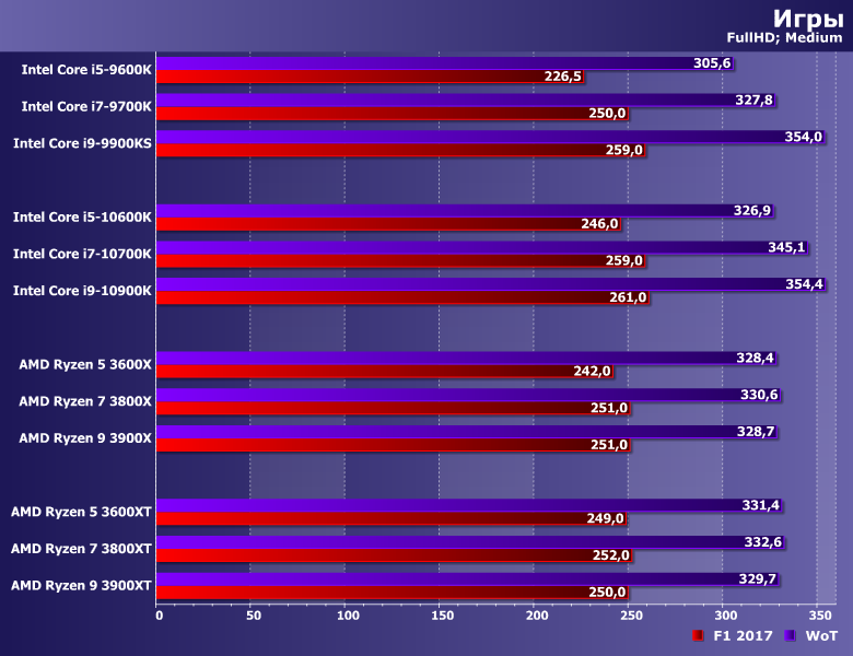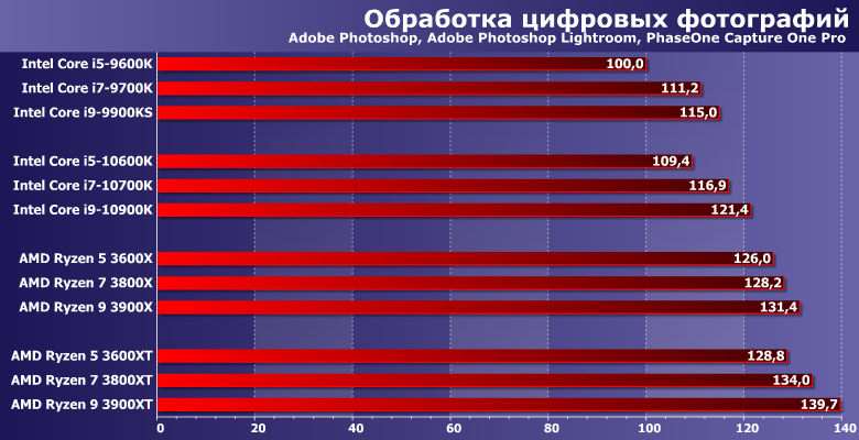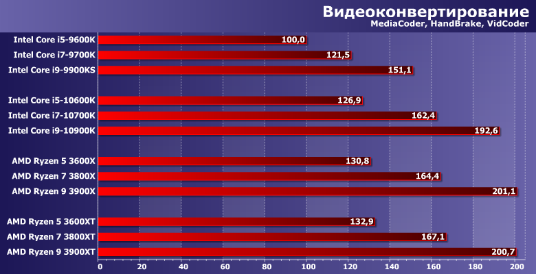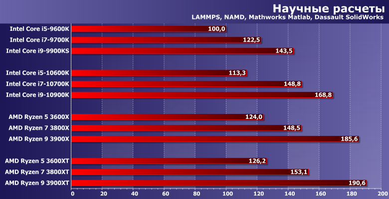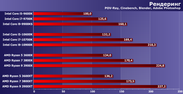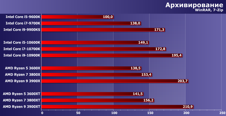 Прочее окружение традиционно: видеокарта AMD Radeon Vega 56, SATA SSD и 16 ГБ памяти DDR4. Тактовая частота памяти в большинстве случаев максимальная по спецификации процессоров. Технологии Intel Multi-Core Enhance и AMD Precision Boost Overdrive. Они (наряду с частотой памяти) на производительность немного повлиять могут, а их использование требования к плате и чипсету делают более конкретными, но в штатном режиме никаких проблем нет. Да и само по себе включение МСЕ без разгона увеличивает производительность Core i9-10900K лишь на 3% при росте энергопотребления на 5%, в чем мы уже убедились при знакомстве с ним. Поэтому практического смысла, на наш взгляд все равно не имеет: либо разгонять вручную тщательно (благо процессоры Intel все еще позволяют в данном случае добиваться каких-то интересных результатов), либо оставить все работать в штатном режиме.