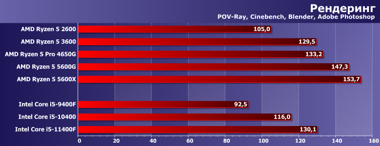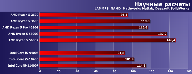 Характер нагрузки схожий — предпочтения программ немного другие. В частности, меньше «кэшелюбивость», так что APU от ограниченности L3 не страдают. 4650G оказался даже не хуже 3600Х — и, соответственно, быстрее 3600. 5600G на такой подвиг оказался неспособен — хотя и все равно оказался вторым среди всех участников. А вот 11400F в данном случае ограничения теплопакета тоже мешают — зато переработанный FPU позволяет выйти хотя бы на уровень Zen2. И прирост производительности за три года уже ближе к 40%. Но у AMD по-прежнему порядка полутора.
