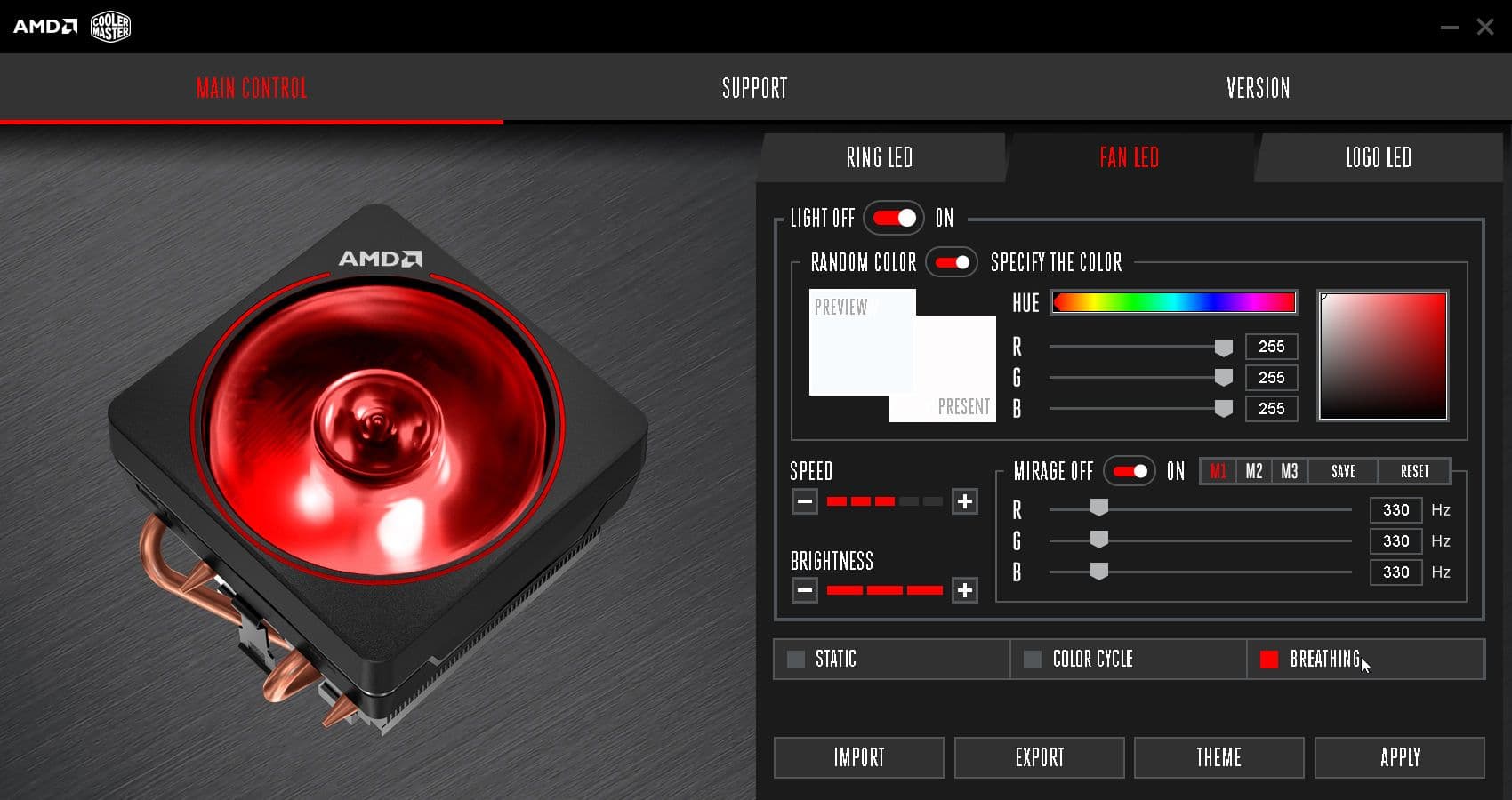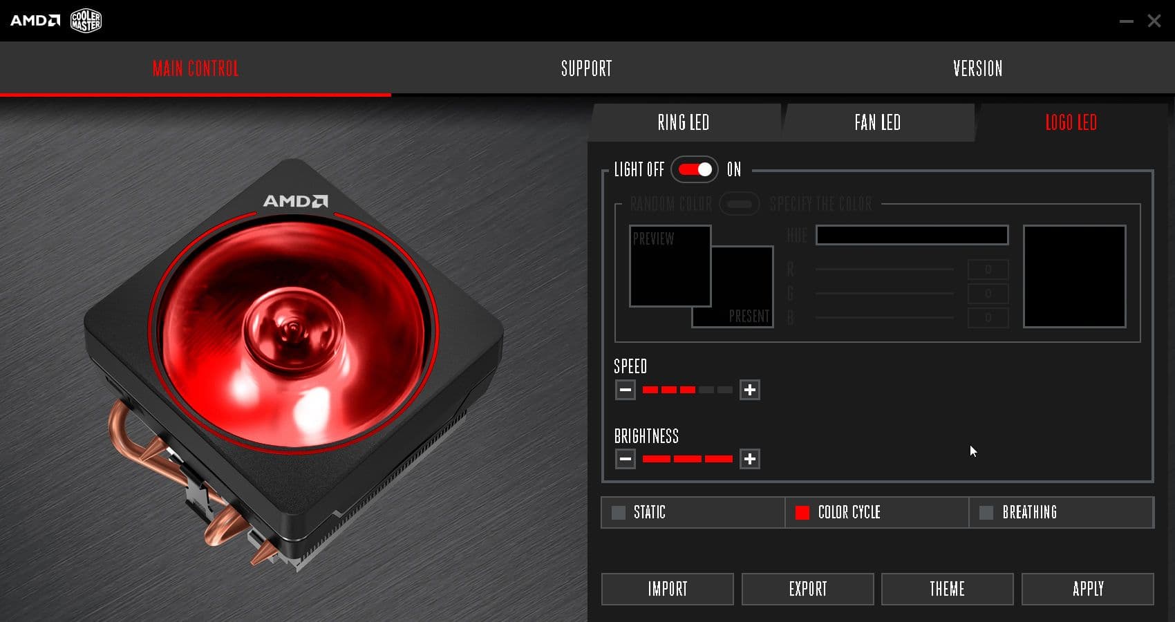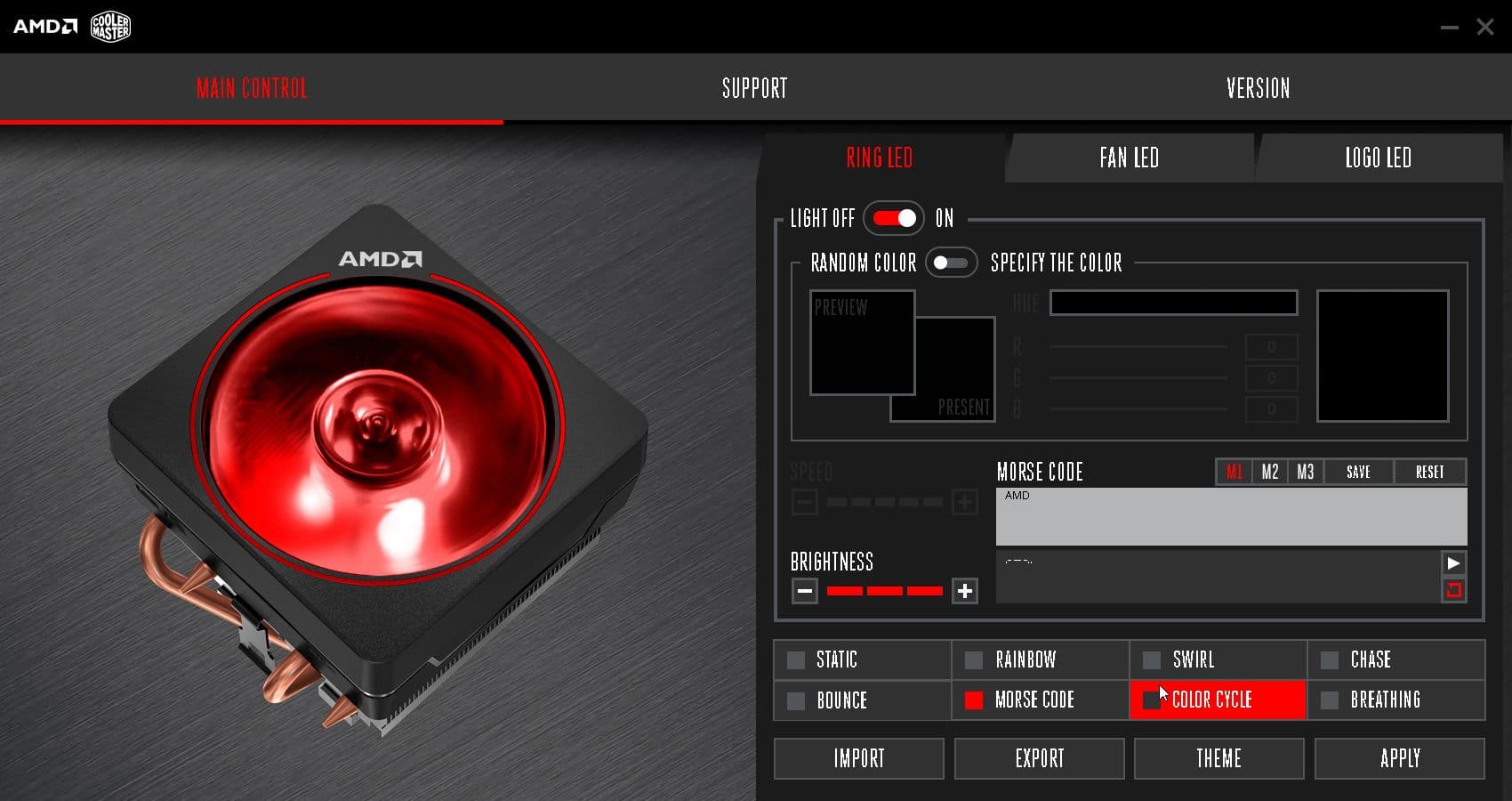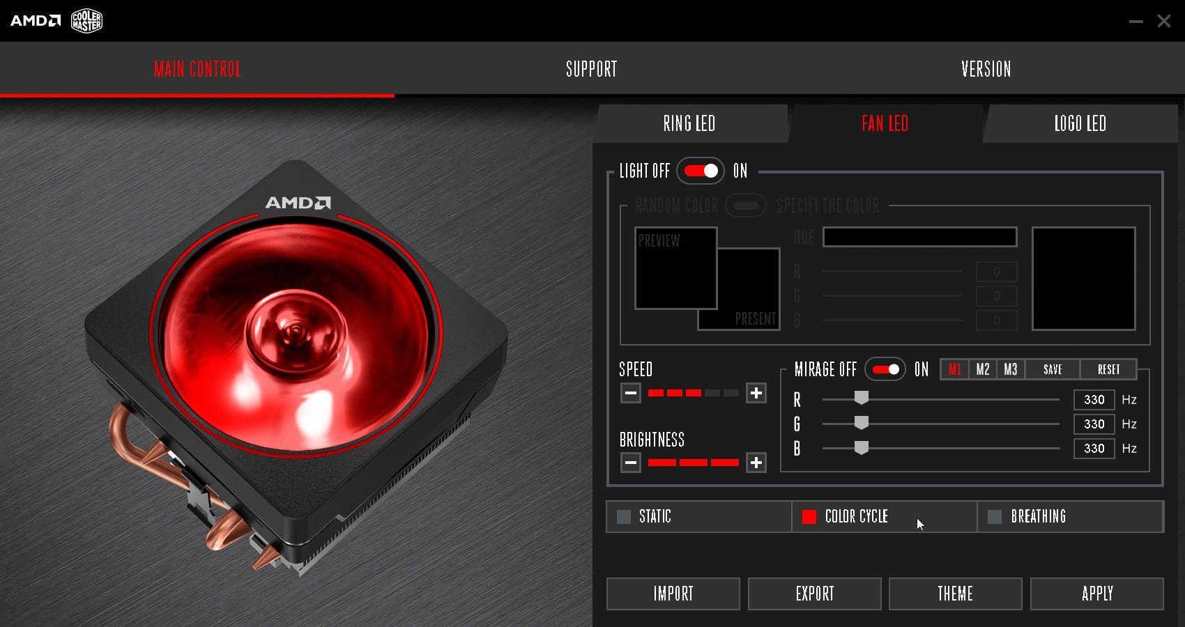 На кожухе есть полоска из полупрозрачного пластика, которая огибает вентилятор, а в ее разрыве находится белый логотип AMD, также полупрозрачный. Полоска и логотип подсвечиваются несколькими RGB-светодиодами. Если кулер просто подключить к четырех(трех)контактному разъему на системной плате, то при достаточной величине напряжения питания подсветка будет работать в режиме по умолчанию, как на видео ниже: