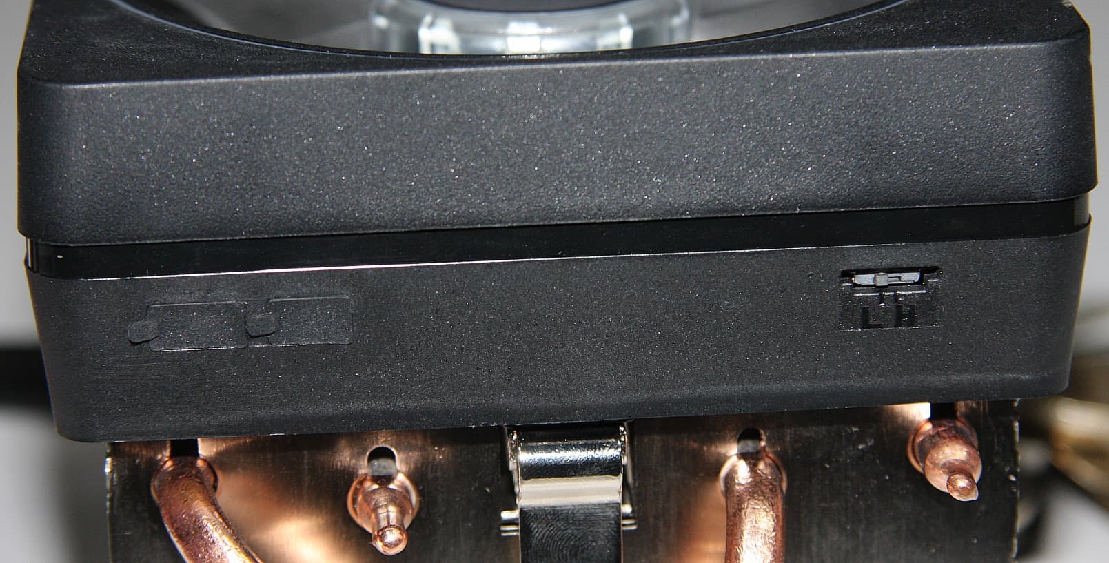 На боковой плоскости кожуха находятся два разъема, закрытые резиновыми заглушками, и неприметный движок. О разъемах — ниже, а движок переключает режим работы вентилятора — пониженная (L) или повышенная (H) скорость вращения. Крыльчатка вентилятора изготовлена из прозрачного пластика и снаружи слегка заматирована. На статоре вентилятора размещены четыре RGB-светодиода, которые подсвечивают крыльчатку изнутри.