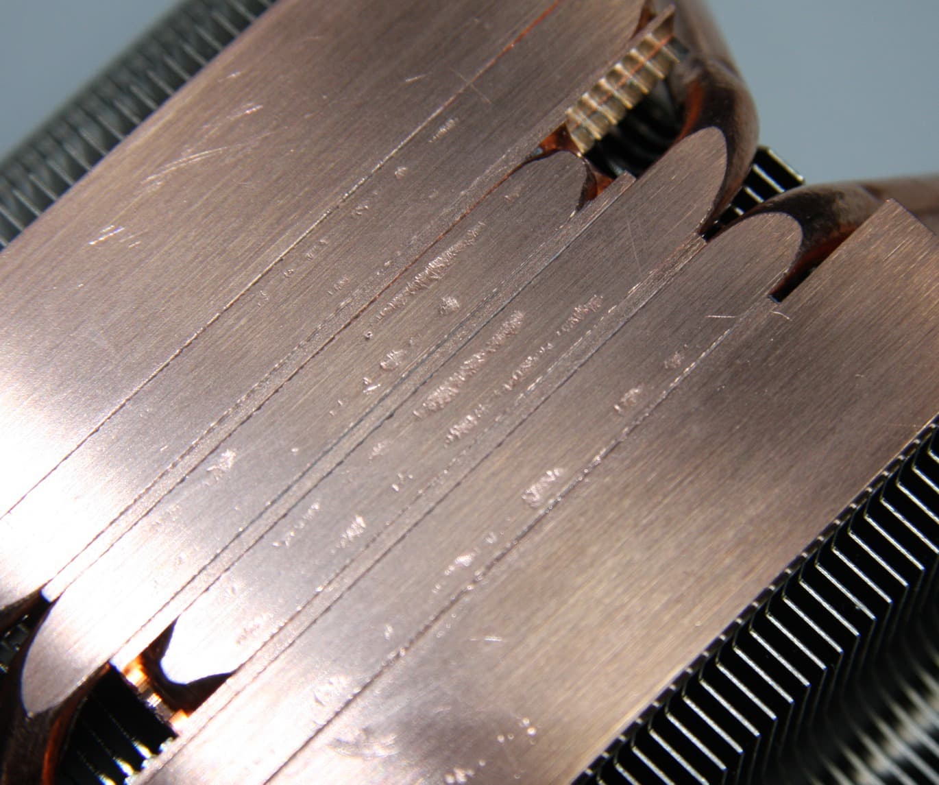 Это, разумеется, несколько ухудшает фактические характеристики кулера. Диаметр трубок 6 мм, длина подошвы 77 мм, ширина 58 мм, при толщине 3 мм по краям и 5 мм ближе к центру. Части трубок, идущие по низу подошвы, сплющены. Низ подошвы и плоскости трубок сошлифованы, но не отполированы. Подошва чуть-чуть, на 0,1-0,2 мм выпуклая вдоль трубок и чуть-чуть вогнута поперек трубок. Сошлифованные плоскости трубок имеют видимые, но практически не ощущаемые, если провести ногтем, дефекты поверхности.