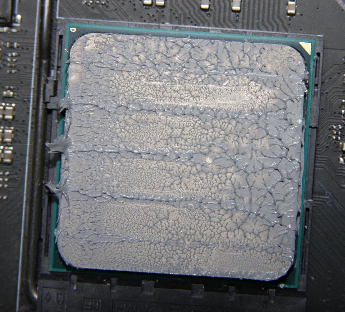 Видно, что на большей части площади соприкосновения подошвы и процессора слой термопасты очень тонкий, а ее избыток выдавливается к краям.
