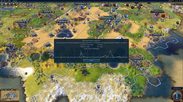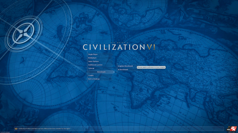 Для тестирования производительности в реальных играх воспользуемся встроенным бенчмарком Civilization VI. Для этого в главном меню игры выбираем Benchmark, и он автоматически стартует.