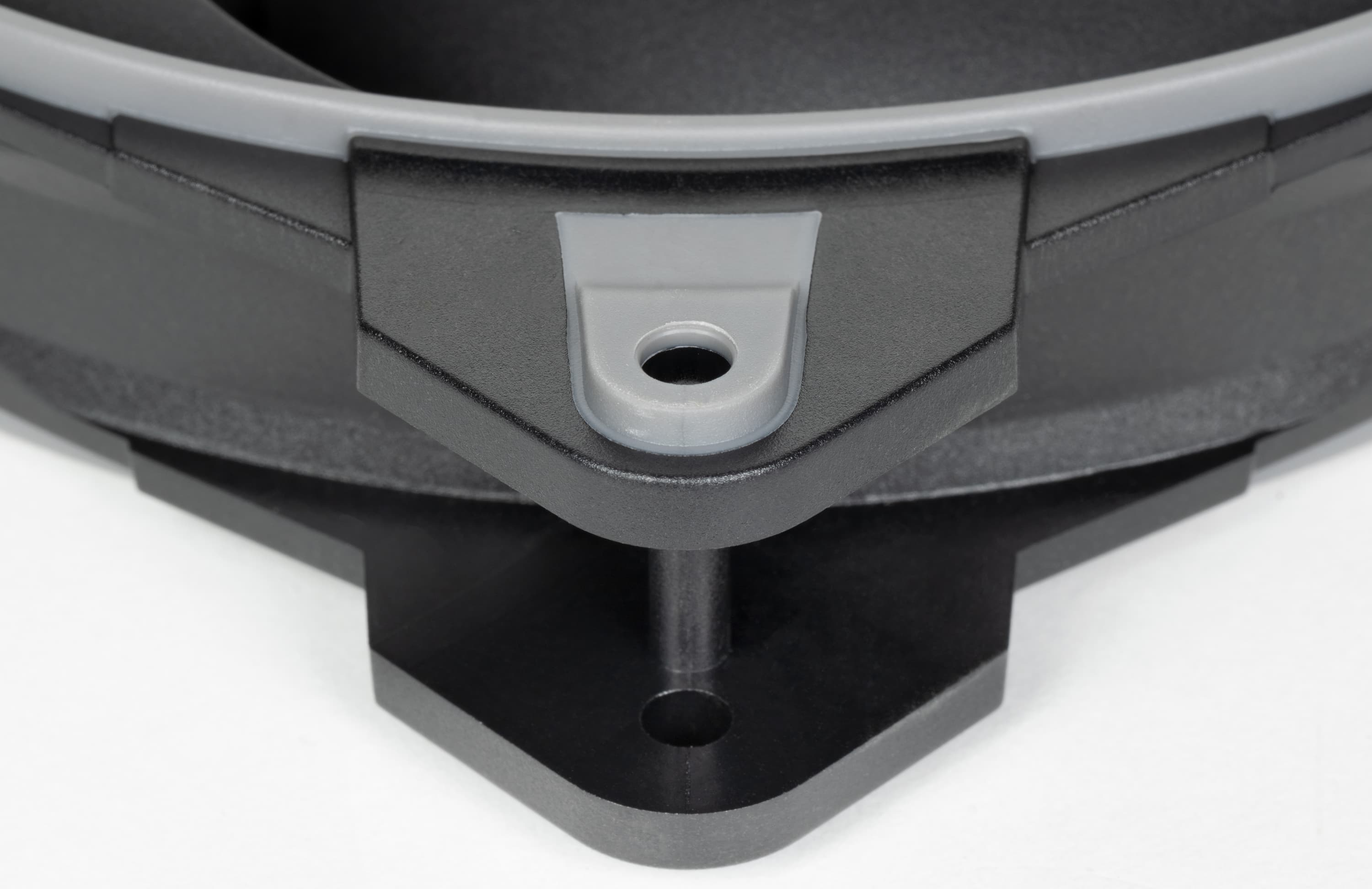 По замыслу разработчиков, это должно обеспечивать виброразвязку вентилятора от места крепления. Однако если прикинуть соотношение массы вентилятора к жесткости вставок, то становится понятно, что резонансная частота конструкции получается очень высокой, то есть практически никакой эффективной виброразвязки быть не может. Кроме того, гнезда, куда вворачиваются крепежные саморезы, являются частью собственно рамки вентилятора, поэтому вибрация от вентилятора будет через саморезы без помех передаваться на то, на чем закреплен вентилятор. В итоге, такую конструкцию можно рассматривать только в качестве элемента дизайна вентилятора.