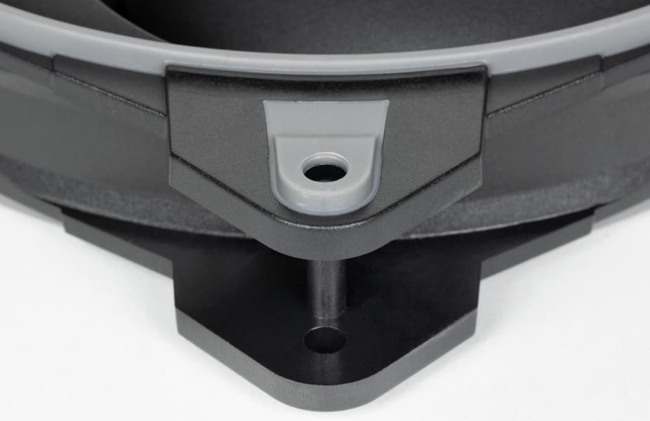 В углах рамки вентилятора есть виброизолирующие вставки из упругого, но довольно жесткого пластика.