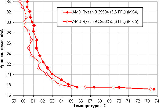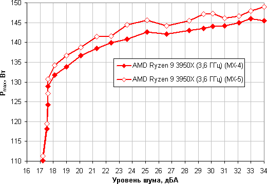 Приняв 25 дБА за критерий условной бесшумности, получим, что максимальная мощность процессора, соответствующая этому уровню, составляет порядка 142 Вт (возьмем результат для Arctic MX-4, так как обычно в тестах мы используем именно ее). Если не обращать внимания на уровень шума, то предел мощности можно увеличить где-то до 145 Вт. Еще раз уточним: это в жестких условиях обдува радиатора нагретым до 44 градусов воздухом. При снижении температуры воздуха указанные пределы мощности для бесшумной работы и максимальной мощности возрастают. Результат заметно хуже, чем в случае процессора Intel Core i9-7980XE. Впрочем, при условии достаточно хорошей вентиляции в корпусе данный кулер вполне справится с охлаждением процессора AMD Ryzen 9 3950X, но на возможность существенного разгона рассчитывать уже не стоит.