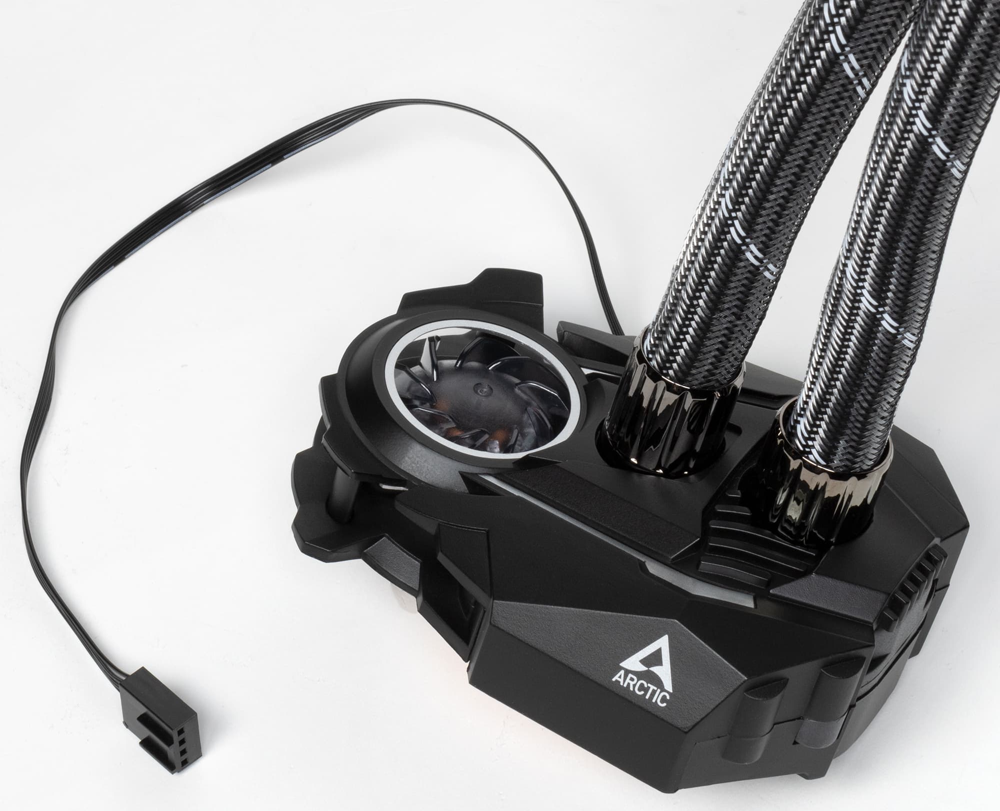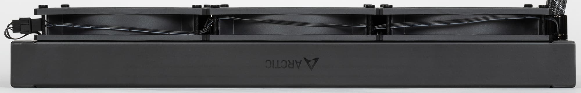 Другая особенность данной СЖО заключается в подключении помпы и всех вентиляторов всего одним кабелем (длиной 26,5 см), отходящим от помпы. Это очень удобно и смотрится аккуратно. Снизу на помпе уложен кабель для подключения встроенного вентилятора, а под оплеткой шлангов проложен кабель для подключения вентиляторов на радиаторе. Отрицательный момент в том, что отслеживать вращение можно только одного вентилятора на радиаторе, и нельзя раздельно регулировать скорость вращения всех четырех вентиляторов и помпы.