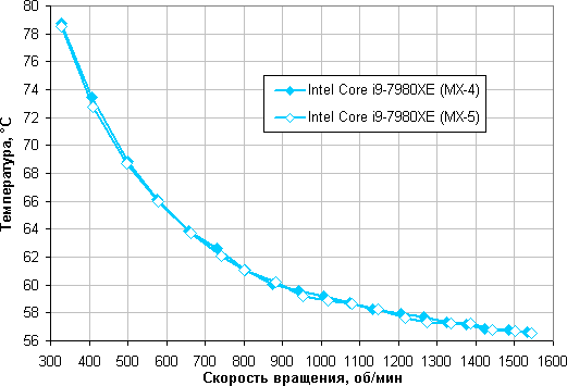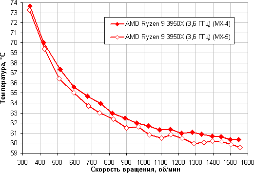 Зависимость температуры процессора при его полной загрузке от скорости вращения вентиляторов: