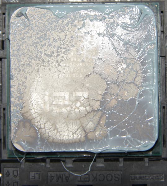 Видно, что термопаста распределилась практически по всей площади крышки процессора, а примерно по центру есть большой участок плотного контакта. Отметим, что крышка этого процессора сама по себе чуть выпуклая к центру. Arctic MX-5 заметно более жидкая по консистенции и имеет легкий голубоватый оттенок.