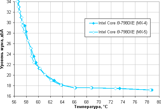 Зависимость уровня шума от температуры процессора при полной загрузке: