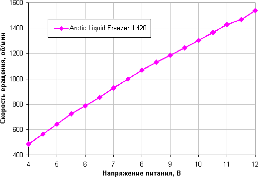 Изменение скорости вращения также плавное, но диапазон регулировки с помощью напряжения заметно у́же. Вентиляторы останавливаются при 3,5—3,6 В, а при 3,6—4,1 В запускаются. Видимо, в случае необходимости их допустимо подключать к 5 В. Вентилятор на помпе останавливается при 3,4 В, а запускается только при 6,7 В. Насчет самой помпы не понятно, так как отследить ее вращение сложно.