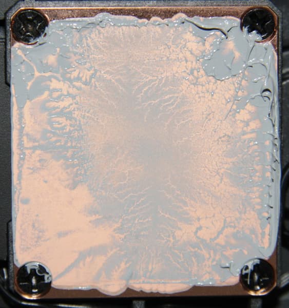 В данном случае также в центре есть большое пятно плотного контакта. (Распределение термопасты, конечно, немного изменилось при разъединении процессора и помпы.)