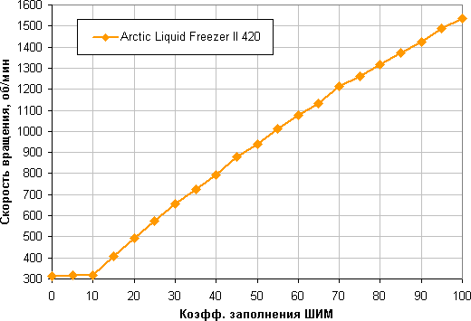Отличный результат — очень широкий диапазон регулировки и плавный рост скорости вращения при изменении коэффициента заполнения от 10% до 100%. При снижении коэффициента заполнения (КЗ) до 0 вентиляторы не останавливаются. Это может иметь значение, если пользователь хочет создать гибридную систему охлаждения, которая при низкой нагрузке работает полностью или частично в пассивном режиме.