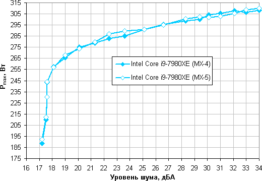 Приняв 25 дБА за критерий условной бесшумности, получим примерную максимальную мощность процессоров, соответствующих этому уровню. Это порядка 290 Вт для процессора Intel Core i9-7980XE. Если не обращать внимания на уровень шума, то пределы мощности можно увеличить где-то до 310 Вт. Еще раз уточним, это в жестких условиях обдува радиатора нагретым до 44 градусов воздухом, при снижении температуры воздуха указанные пределы мощности для бесшумной работы и максимальной мощности возрастают.