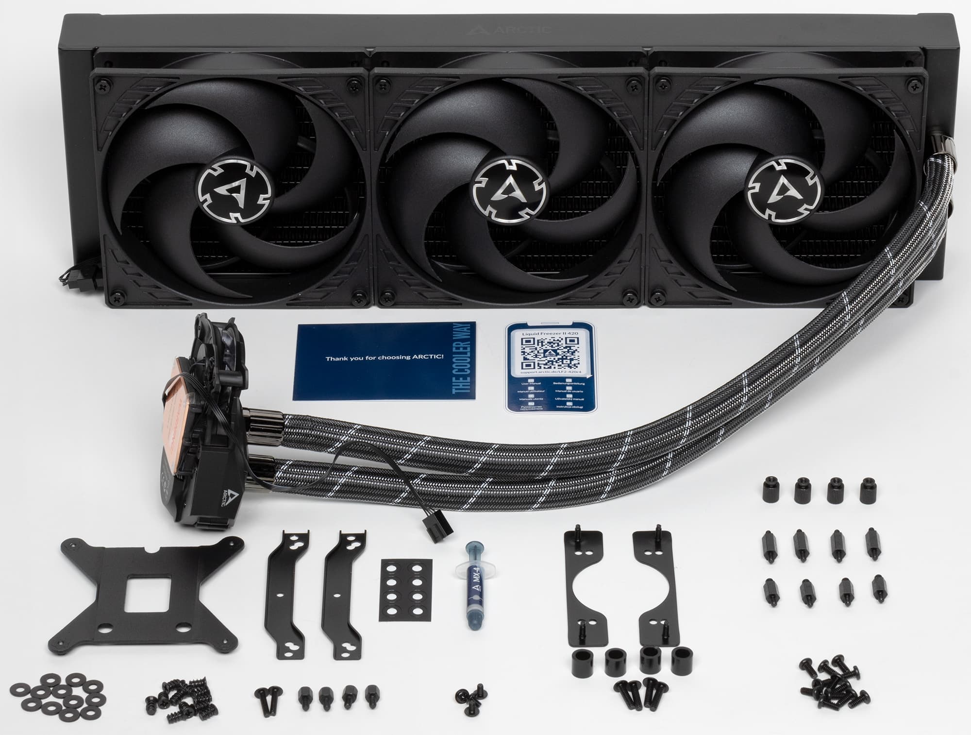 Внутри коробки находятся радиатор с установленными вентиляторами и с подключенной помпой, комплект крепежа, термопаста в шприце, карточка лояльности и карточка с кодом QR.