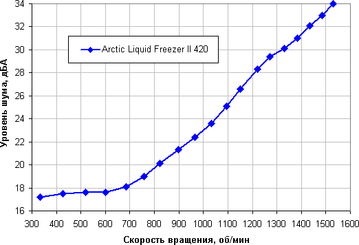 Уровень шума этой системы охлаждения меняется в не очень широком диапазоне. Зависит, конечно, от индивидуальных особенностей и других факторов, но где-то от 40 дБА и выше шум, с нашей точки зрения, очень высокий для настольной системы; от 35 до 40 дБА уровень шума относится к разряду терпимых; ниже 35 дБА шум от системы охлаждения не будет сильно выделяться на фоне типичных небесшумных компонентов ПК — корпусных вентиляторов, вентиляторов на блоке питания и на видеокарте, а также жестких дисков; а где-то ниже 25 дБА кулер можно назвать условно бесшумным. В данном случае систему можно считать тихой. Фоновый уровень был равен 16,3 дБА (условное значение, которое показывает шумомер).