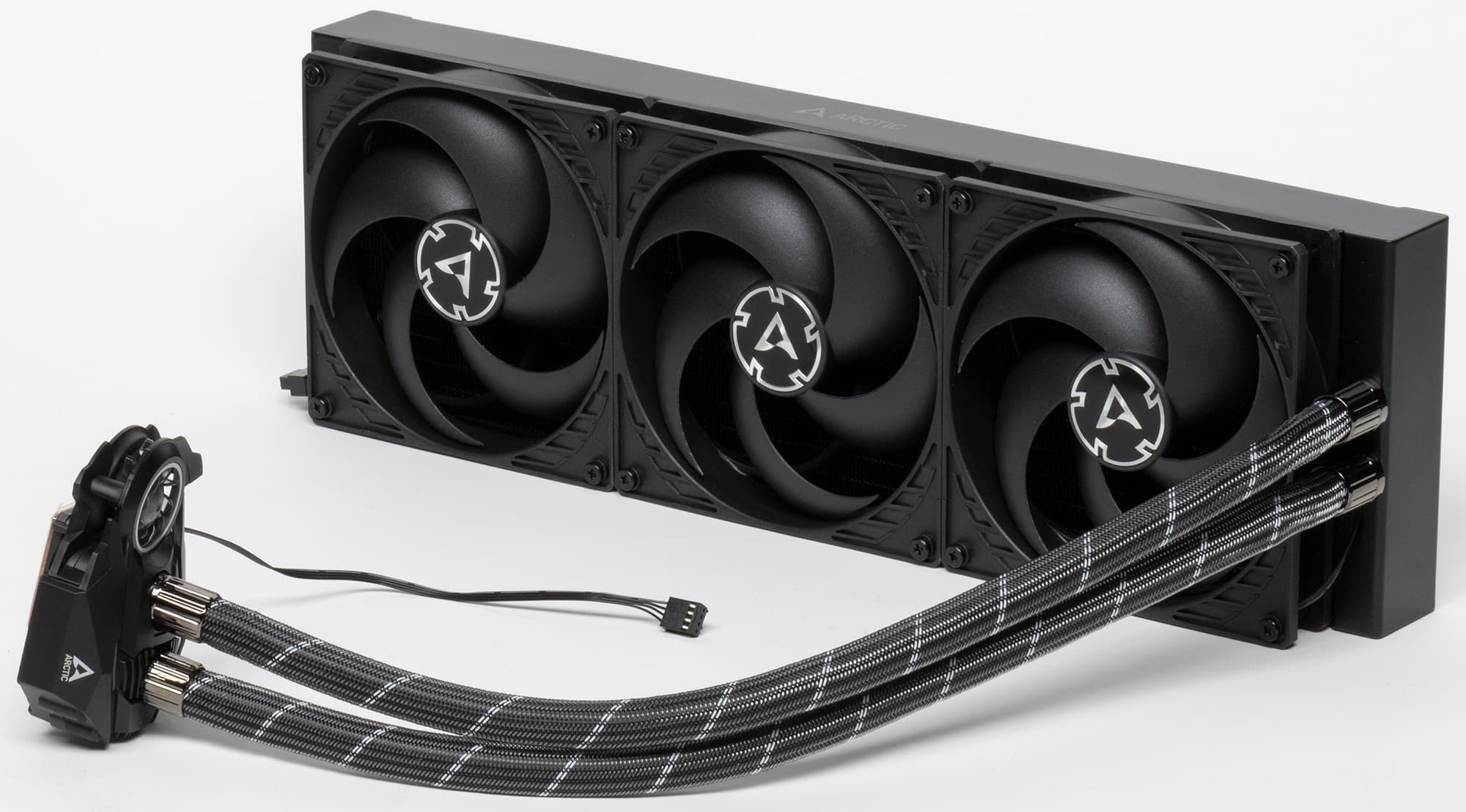 На основе системы жидкостного охлаждения Arctic Liquid Freezer II 420 можно создать условно бесшумный компьютер (уровень шума 25 дБА и ниже), оснащенный процессором типа Intel Core i9-7980XE (Intel LGA2066, Skylake-X (HCC)), если потребление процессора под максимальной нагрузкой не будет превышать 290 Вт, а температура внутри корпуса не повысится выше 44 °C. В случае чиплетного процессора AMD Ryzen 9 3950X эффективность кулера заметно ниже, и для соблюдения указанных выше условий максимальная мощность, потребляемая процессором, должна быть не выше 142 Вт. При снижении температуры охлаждающего воздуха и/или менее жестких требованиях к уровню шума пределы мощности во всех случаях можно существенно увеличить. Отметим хорошее качество изготовления, удобное подключение системы всего одним кабелем и дополнительный вентилятор для охлаждения VRM.