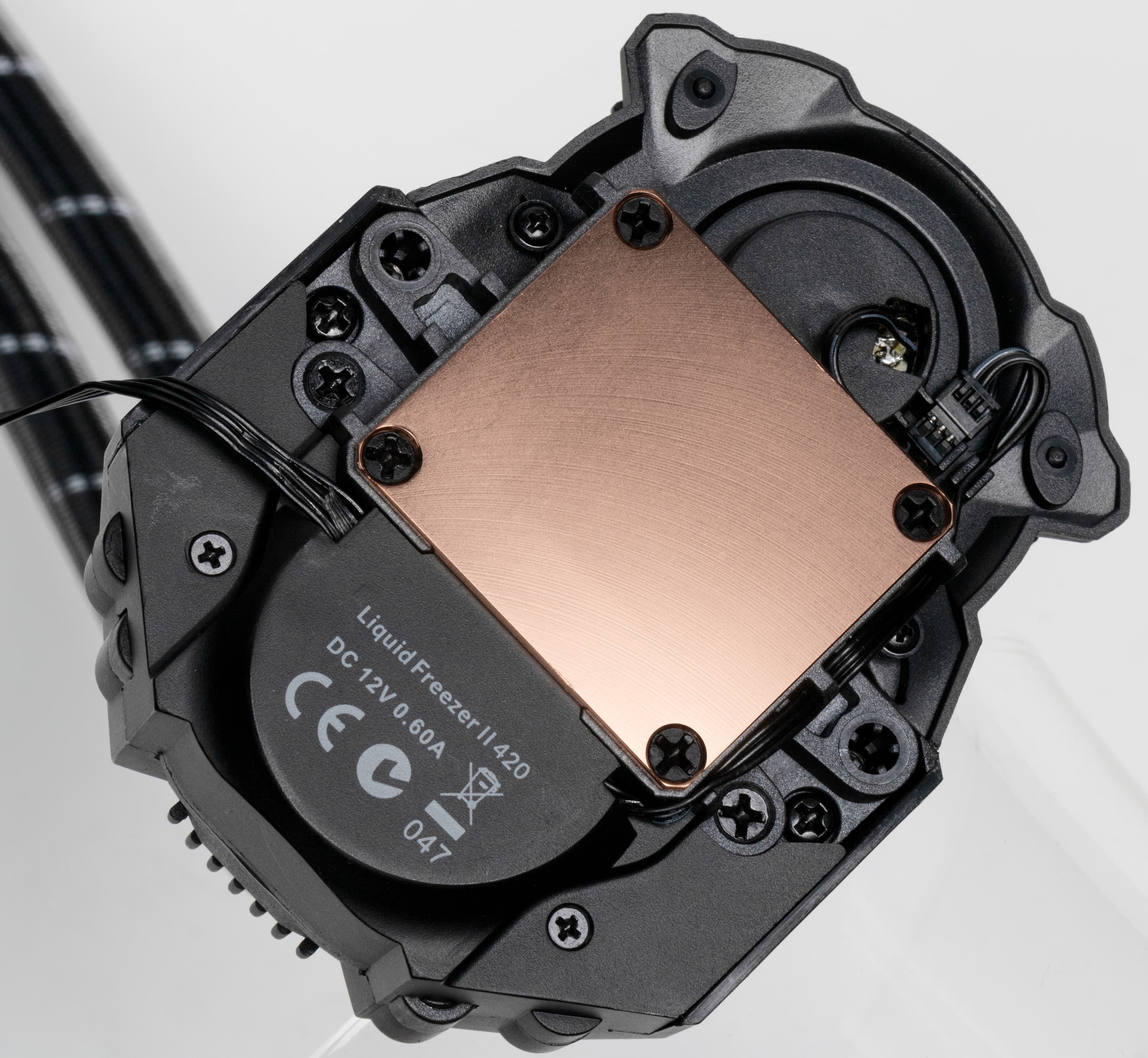Помпа интегрирована в один блок с теплосъемником. Подошвой теплосъемника, непосредственно прилегающей к крышке процессора, служит медная пластина. Ее внешняя поверхность шлифованная и слегка полированная. Плоскость подошвы чуть-чуть (где-то на 0,1 мм) выпуклая к центру.