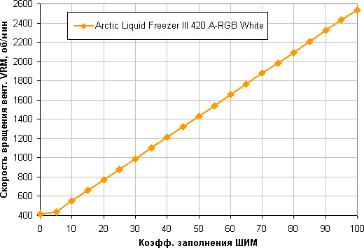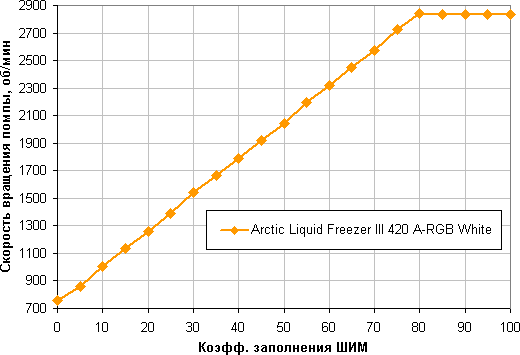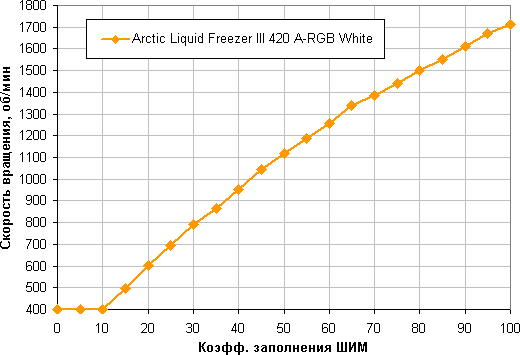 Отличный результат — монотонный и близкий к линейному рост скорости вращения при изменении коэффициента заполнения от 10% до 100%, диапазон регулировки скорости вращения широкий. При снижении коэффициента заполнения (КЗ) до 0% вентиляторы не останавливаются. Это может иметь значение, если пользователь хочет создать гибридную систему охлаждения, которая при низкой нагрузке работает полностью или частично в пассивном режиме.