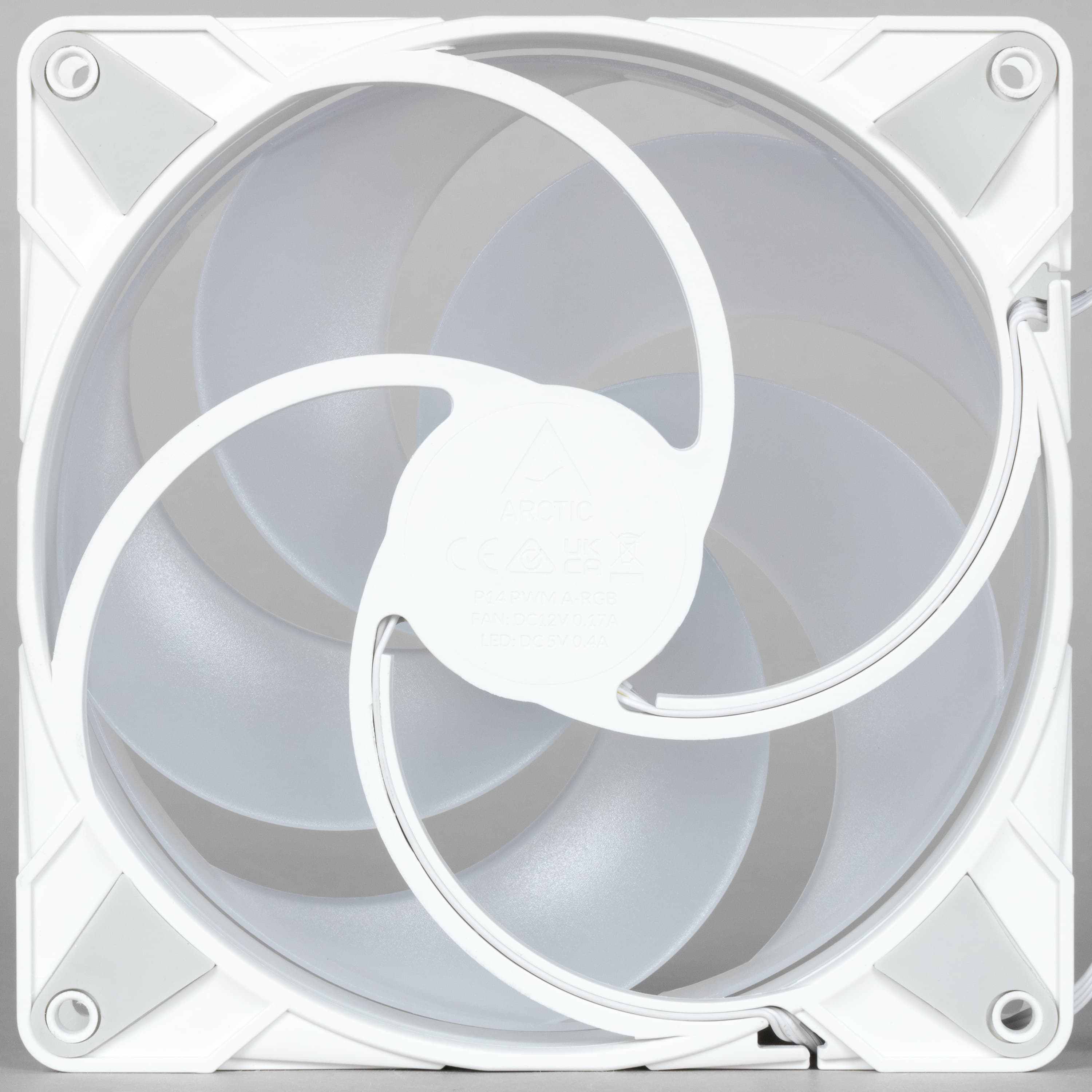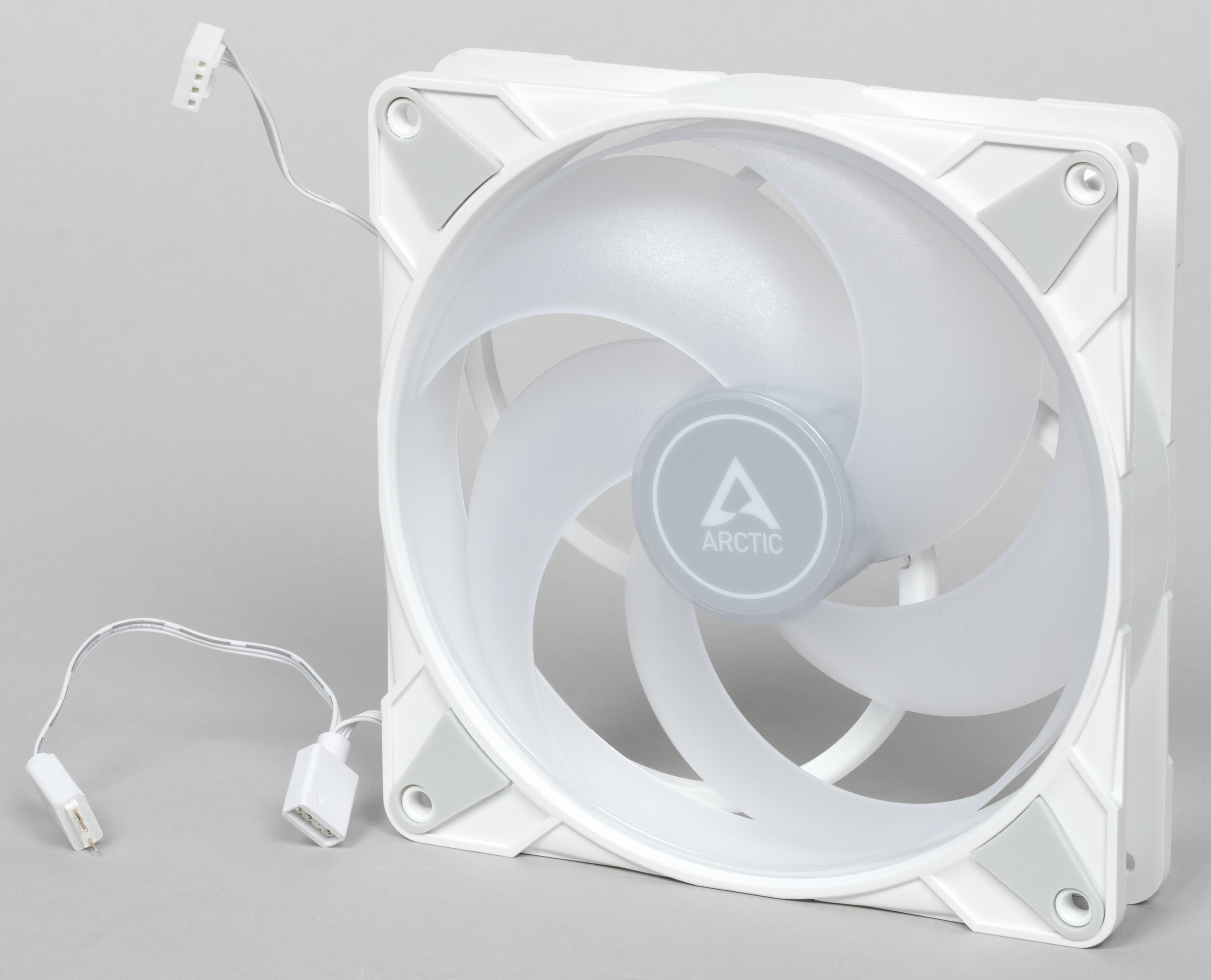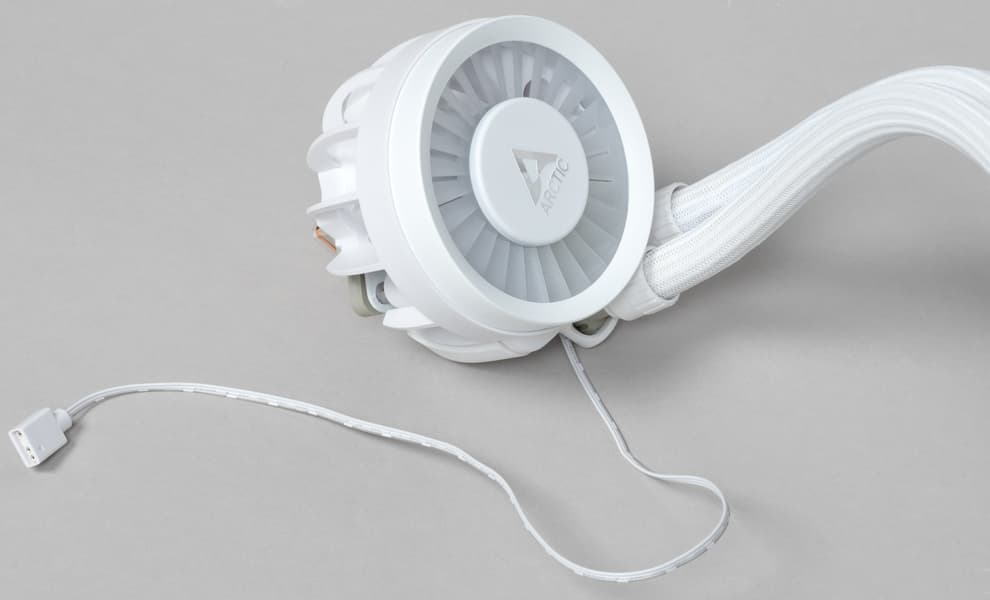 Форма крыльчатки вентилятора намекает на способность вентилятора создавать высокое статическое давление, что в данном случае и нужно. Лопасти крыльчатки заключены в кольцо, что может повышать эффективность вентилятора. Крыльчатка вентилятора изготовлена из белого полупрозрачного пластика. На статоре вентилятора по окружности размещены ARGB-светодиоды, которые подсвечивают крыльчатку изнутри. Кабели от вентиляторов оснащены стандартными четырех- и трехконтактными разъемами для подключения моторов и адресуемой подсветки (последний дополнен проходным разъемом для подключения цепочкой).