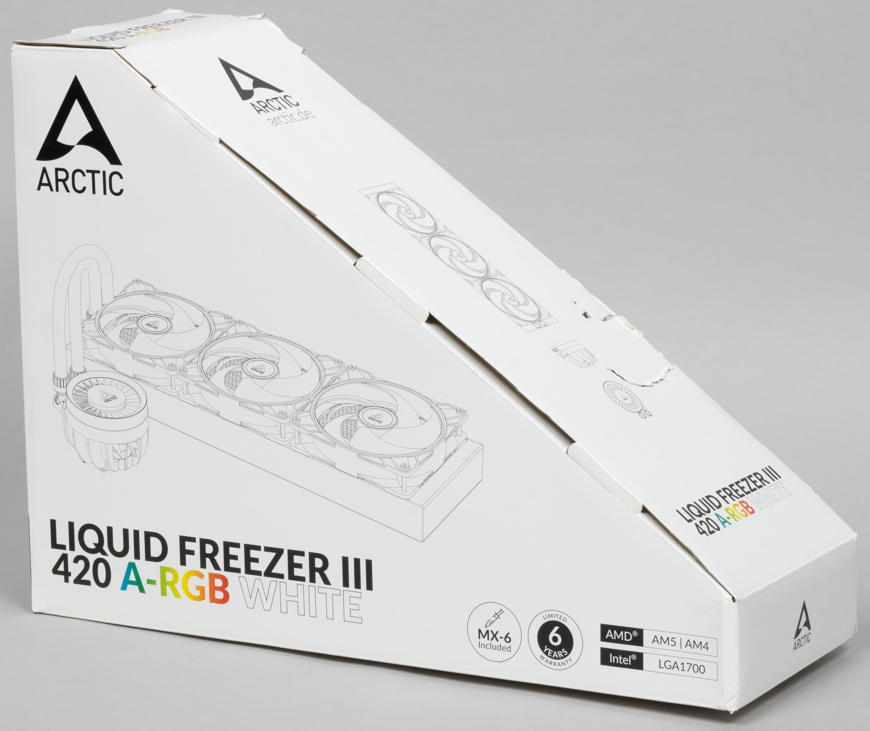 Поставляется система жидкостного охлаждения Arctic Liquid Freezer III 420 A-RGB White в коробке из среднего по толщине гофрированного картона.