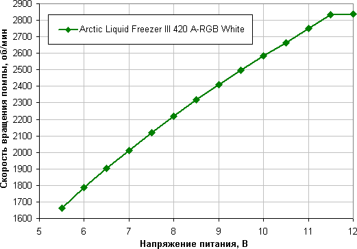 Скорость вращения помпы и вентилятора на ней также можно регулировать с помощью ШИМ и напряжения питания. Приведем соответствующие графики.