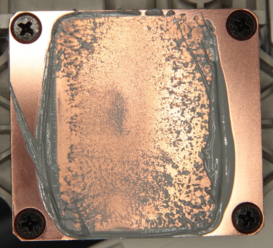 Видно, что термопаста распределилась тонким слоем почти на всю площадь крышки процессора, а ее избытки выдавились за края. Участок плотного контакта расположен примерно по центру и имеет большую площадь. (Распределение термопасты, конечно, немного изменилось при разъединении процессора и помпы.)