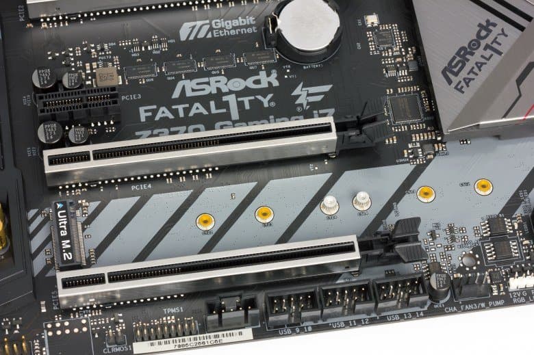 Для установки видеокарт, плат расширения и накопителей на материнской плате ASRock Fatal1ty Z370 Professional Gaming i7 имеется три слота с форм-фактором PCI Express x16, два слота PCI Express 3.0 x1 и четыре разъема M.2.