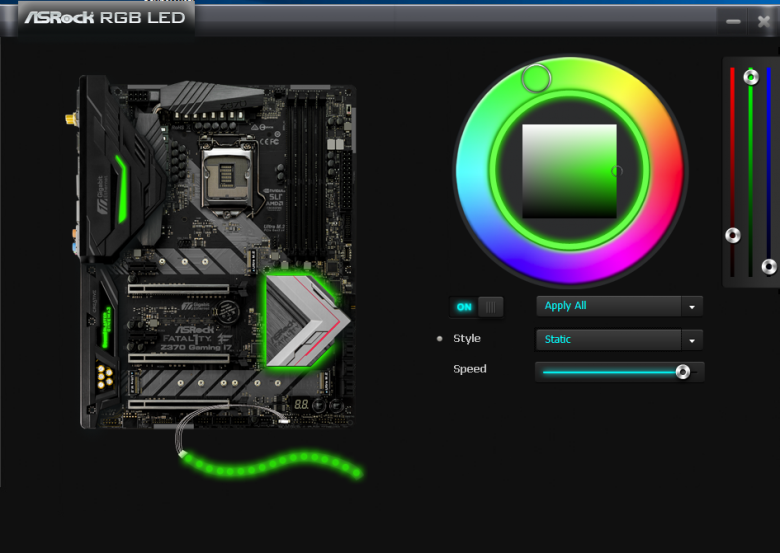 Для управления подсветкой используется утилита ASRock RGB LED. Данная утилита позволяет настраивать подсветку каждой зоны в отдельности, то есть выбирать цвет и эффект подсветки.
